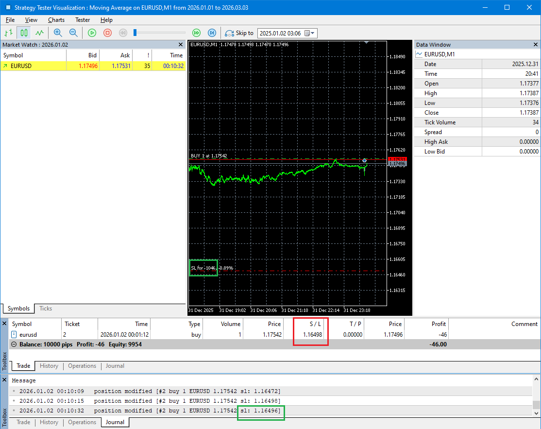 На каждом тике (F12) будет воспроизводиться ситуация, когда в Журнале показан новый уровень SL, а в табличной GUI - нет. При этом SL в виде горизонтальной линии на чарте будет отображаться правильно.
