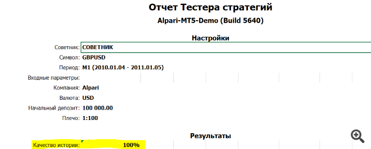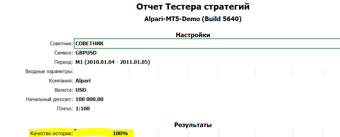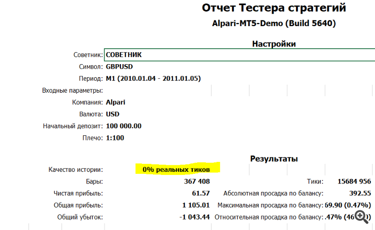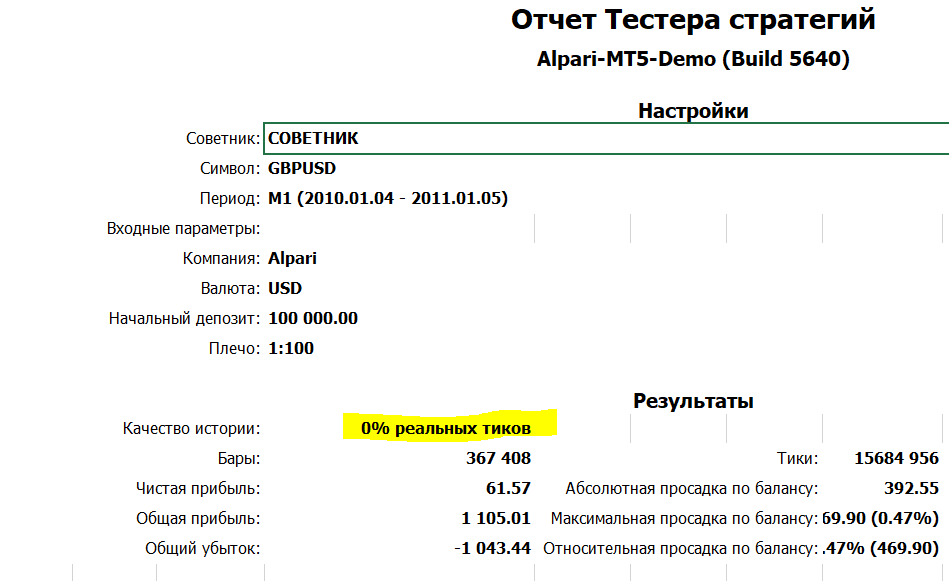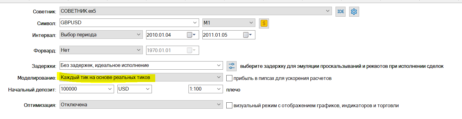 Я протестировал пару GBPUSD с 04.01.2010 по 05.01.2011 выбрал следующие настройки с режимом на реальных тиках