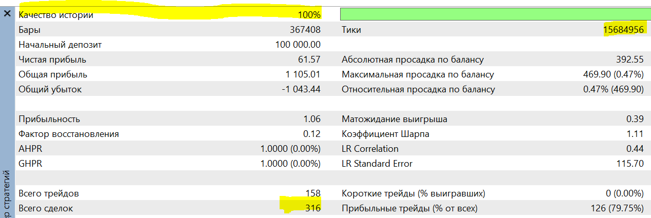 По результатам тестирования вкладка БЕКТЕСТ показала качество тестирования 100% При этом количество тиков и количество ордеров совпало с предыдущим тестом