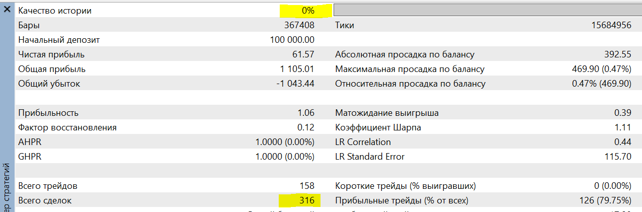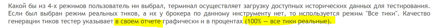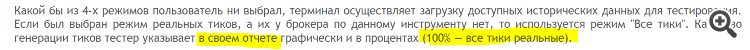 ПРИМЕЧАНИЕ. Как я понял, если в Агент не поступили реальные тики, то режим тестирования автоматически переключается на режим ВСЕ ТИКИ. Но это противоречит утверждению учебника о том что качество генерации тиков равное 100% однозначно свидетельствует о том что тест производился на реальных тиках. Только из за того что МТ5 обещал мне тестирование на реальных тиках, я и начал изучать его... Но пока мне кажется что с этим обещанием все обстоит неоднозначно..