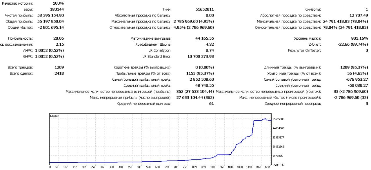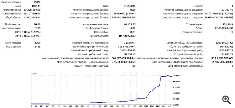 На золоте это не удивительно, рынок сейчас такой. Но вопрос не в этом. Стоило перезагрузить компьютер и пару раз выгрузить теринал, как на том же интервале тестирования при тех же параметрах рост уже составил всего в 330 раз.