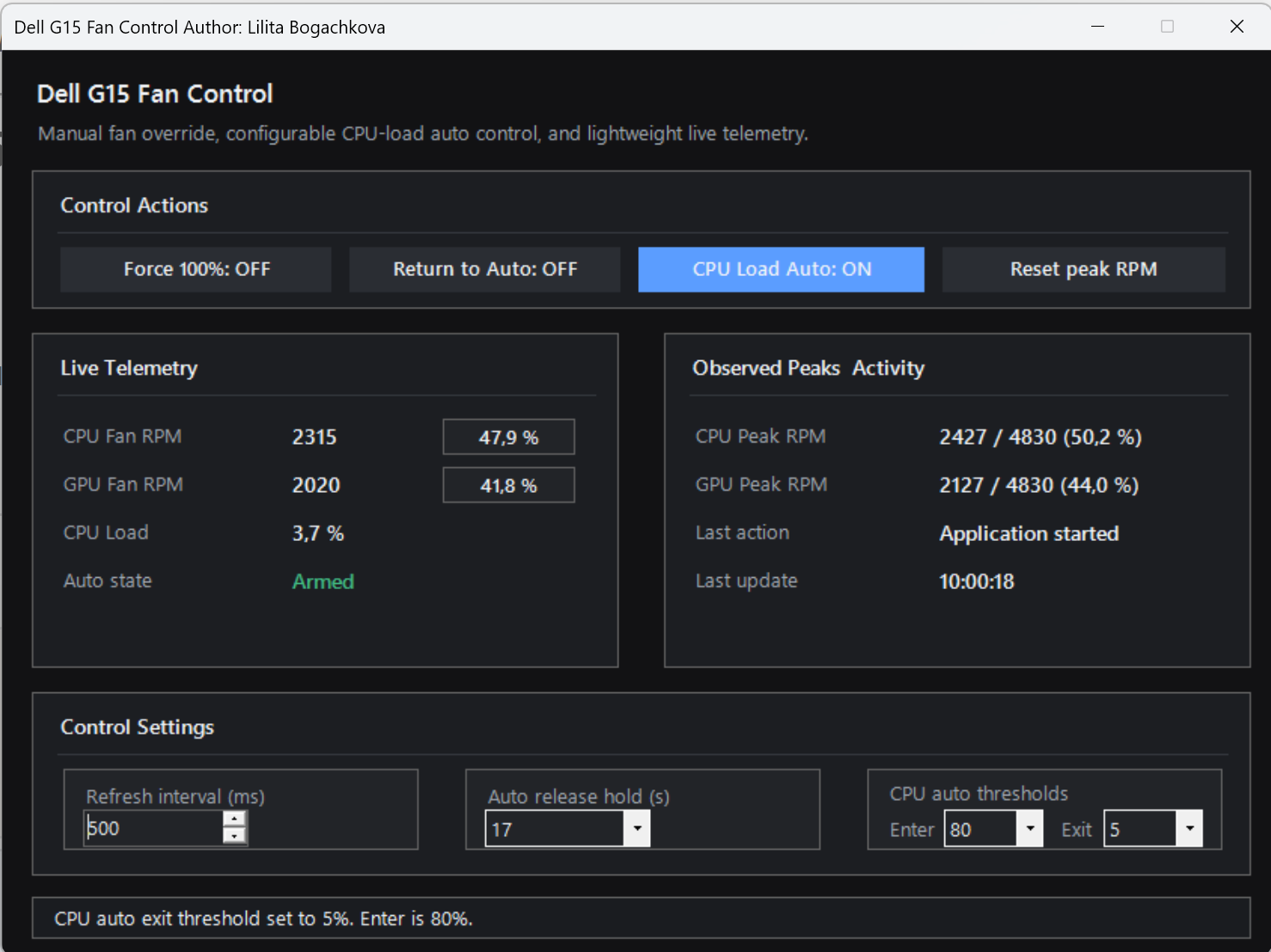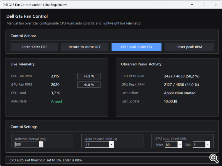 Когда вентиляторы уже зафиксированы на 100% режимом CPU Load Auto , и загрузка CPU становится равной или ниже Exit, программа: