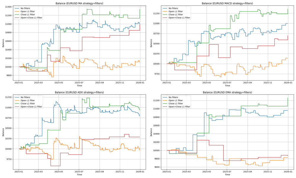 Выводы по результатам использования L1-фильтра в торговых стратегиях MovingAverage, MACD, ADX и EMA