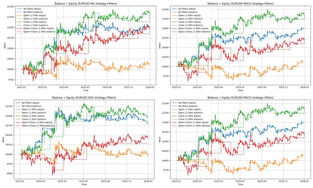 Анализ стратегий Moving Average, MACD, ADX и EMA показал, что наилучшие результаты достигаются при использовании L1-фильтрации на этапе закрытия позиций (на графиках выделены зеленым цветом). Применение фильтра на выходе эффективно подавляет шумовые развороты и ложные сигналы, позволяя удерживать сделки в направлении устойчивого тренда. Это приводит к росту прибыли и Profit Factor, а также к снижению максимальной просадки.