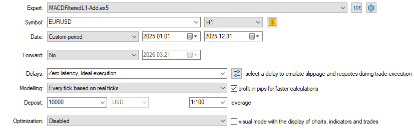 Параметры тестирования с фильтром закрытия сделок L1 Close Filter: