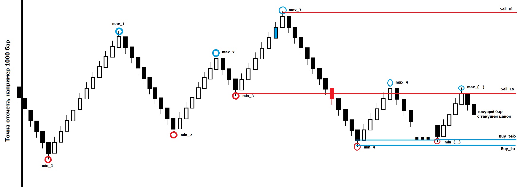 Кратко: При пробитии первоначального максимума max_1, голубым баром, мы запоминаем предыдущий минимум min_3 и новый максимум max_3 и,