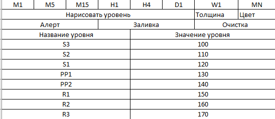 - когда цена достигла значения индикатора: #тикер#, #ТФ#, #наименование уровня#, достиг уровня #значение уровня#. Пример: USDRUB H1 S1 достиг уровня 68.8