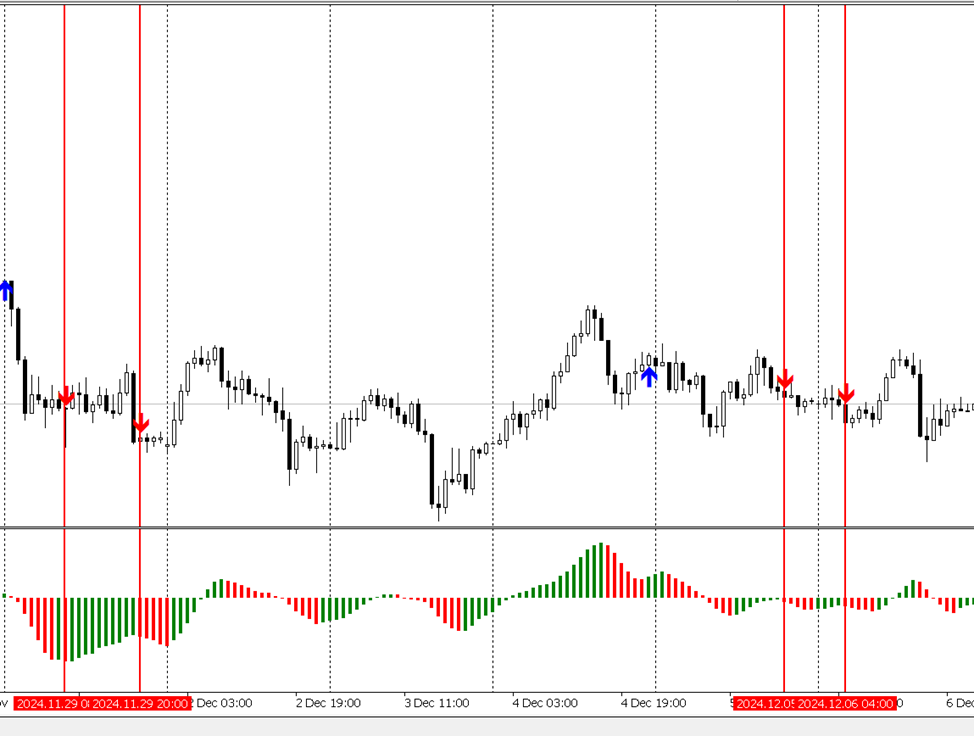 3. Робот открывает сделки по сигналу после закрытия свечи, когда Гистограмма ниже 0, и на закрытие бара гистограмма красного цвета открывается ордер на Селл. На пересечениях гистограммы сверху вниз ордер не открывается.
