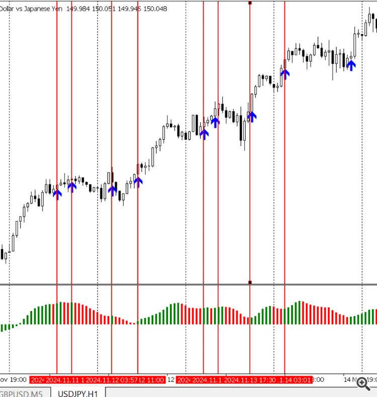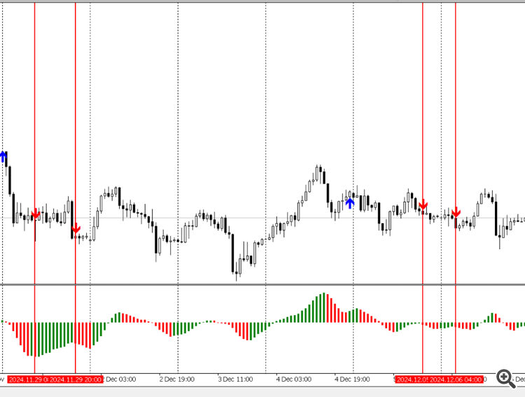 4. На каждом сигнале автоматически открывается ордер по направлению сигнала. Если ордер не закрывается по тейку усредняется на следующем сигнале.
