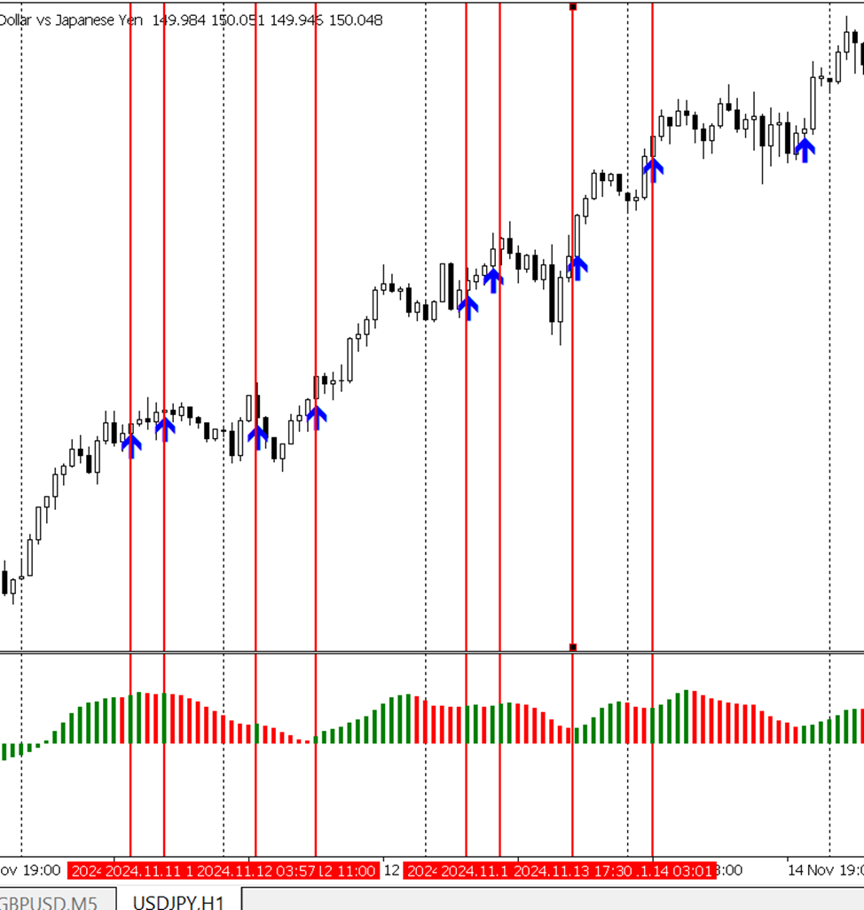 2. Робот открывает сделки по сигналу после закрытия свечи, когда Гистограмма выше 0, и на закрытие бара гистограмма зеленого цвета открывается ордер на Бай. На пересечениях гистограммы снизу вверх ордер не открывается.