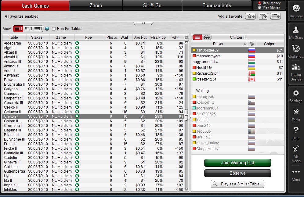 4.Нажатие кнопки Join waiting list на каждый отфильтрованный стол из составленного списка если на нем находятся игроки, помеченные определенными цветами.