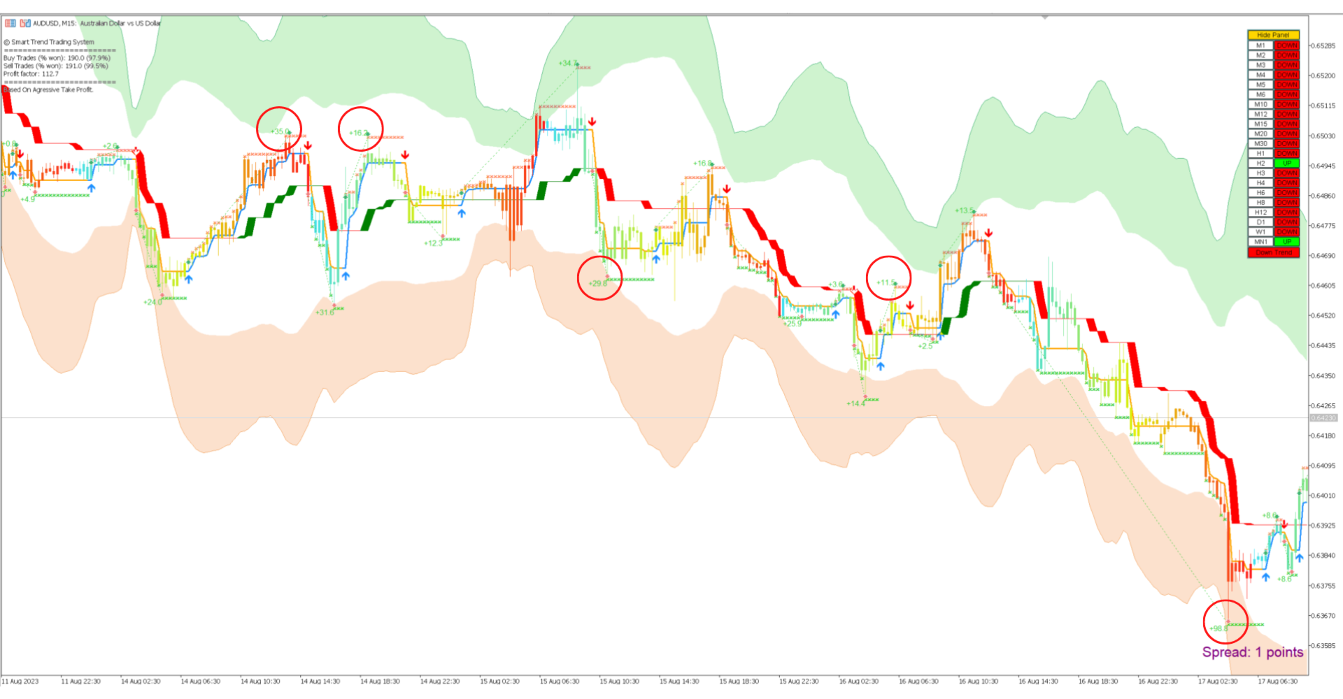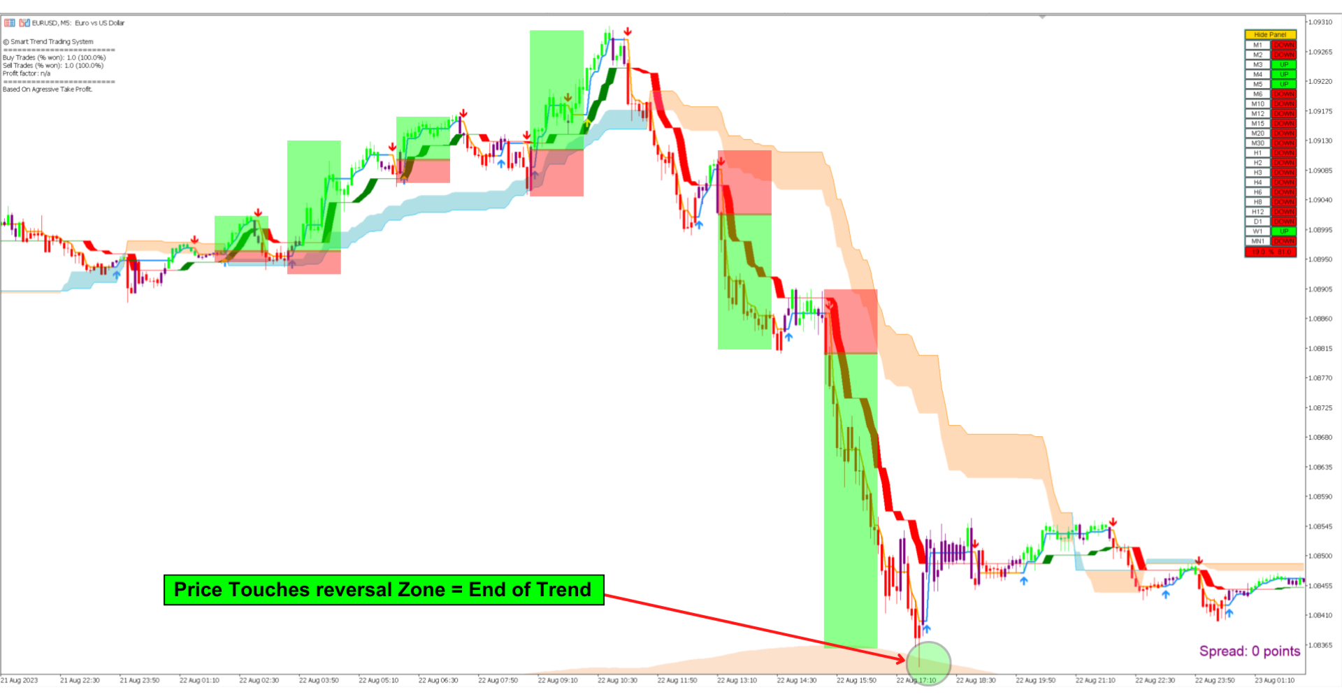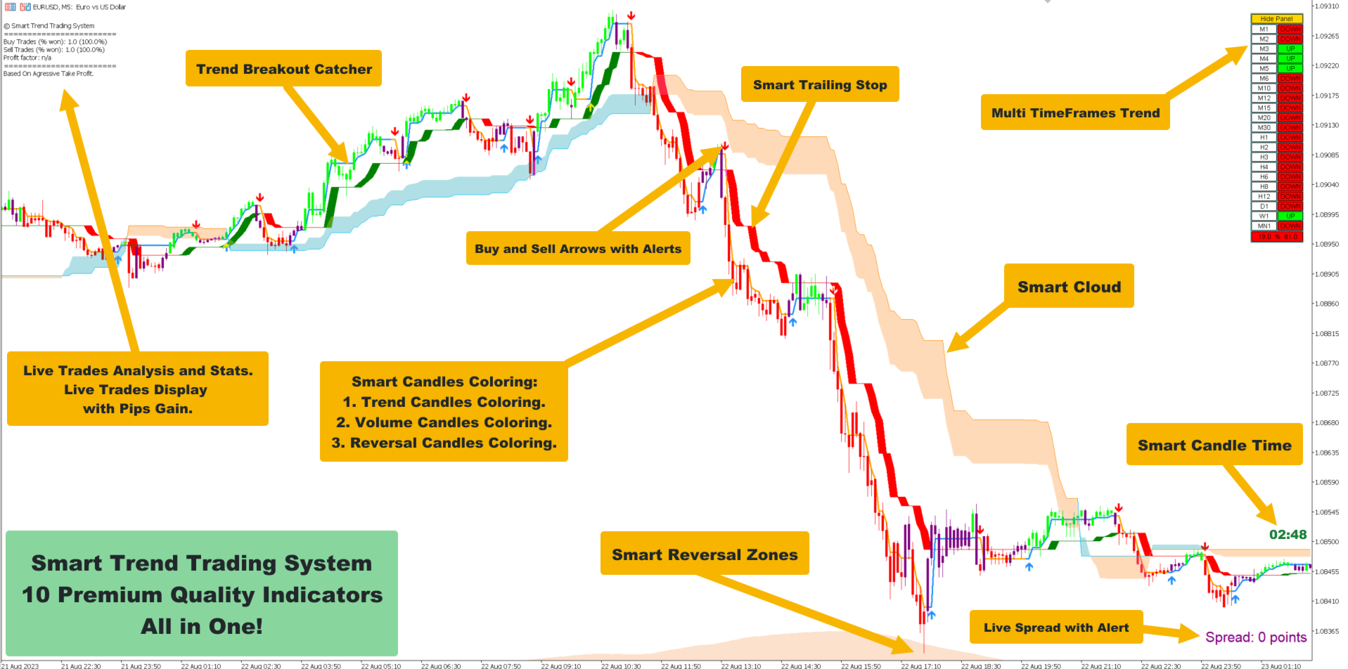 "Smart Trend Trading System" представляет собой комплексный и сложный подход к торговле на форексе, который использует комбинацию тщательно отобранных индикаторов для выявления и использования трендов и потенциальных разворотов тренда на рынке. Эта система использует ансамбль индикаторов, включая Trend Breakout Catcher, Smart Trailing Stop, Smart Cloud, Smart Reversal Zones и Multi-Timeframe Trend Finder, все они разработаны для работы в гармонии и предоставления трейдерам надежного и универсального инструментария.