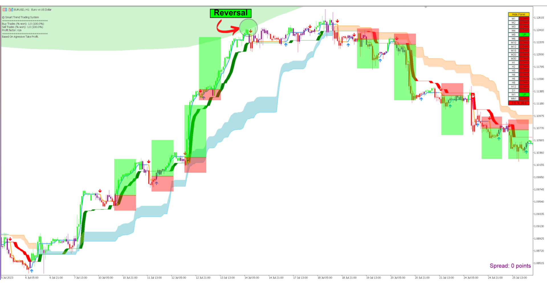 Индикатор Smart Cloud предоставляет визуальное представление о трендах, формируя облако над или под графиком цен. Когда цена находится выше облака, это сигнализирует о восходящем тренде, а когда ниже - о нисходящем. Это упрощает идентификацию тренда и подтверждает торговые решения. Smart Reversal Zones указывает потенциальные точки разворота на рынке, предупреждая трейдеров о возможных разворотах тренда во время откатов.