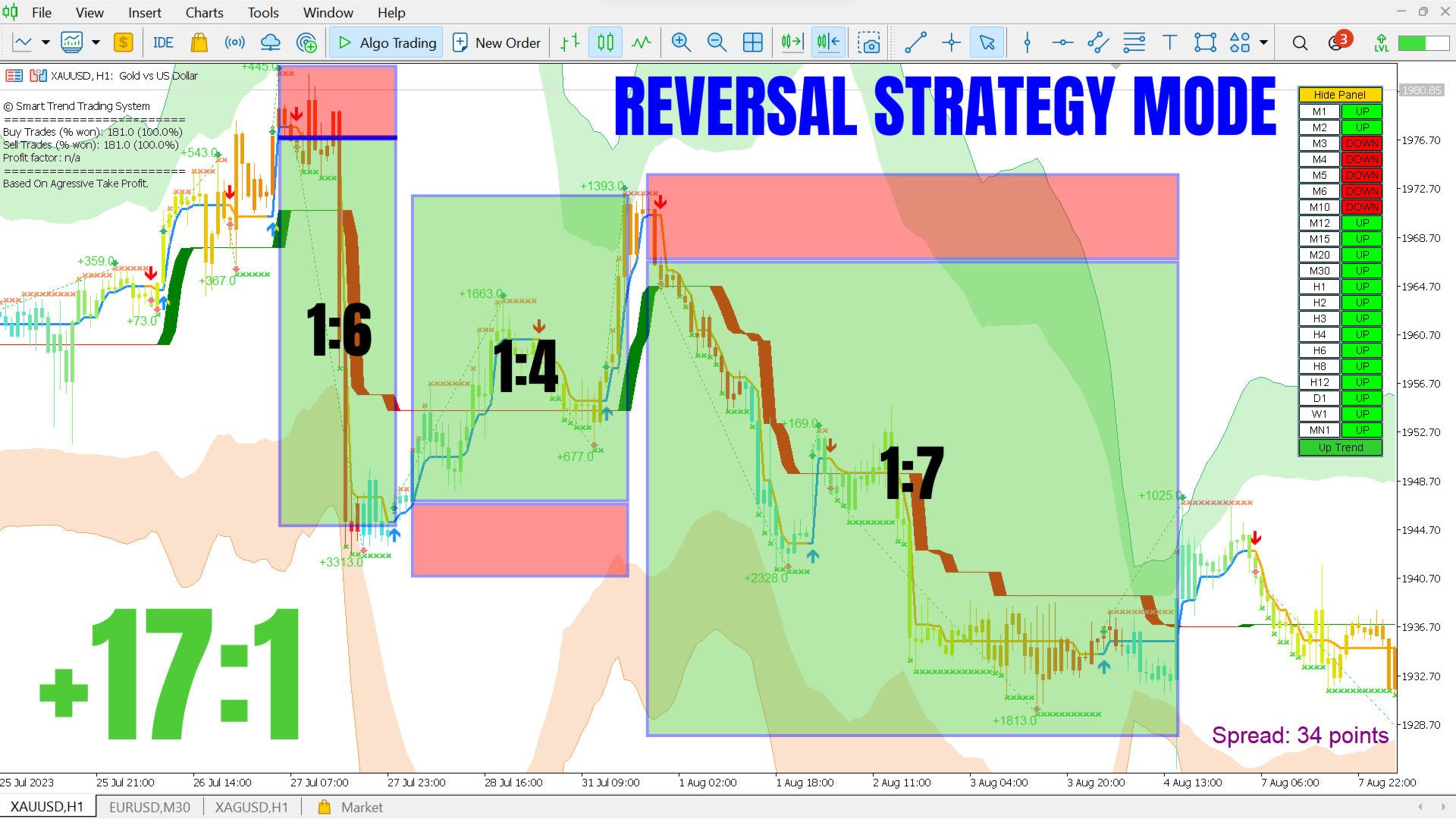 Стратегия разворота: определяет потенциальные развороты тренда, позволяя трейдерам использовать возможности рынка в условиях флета.