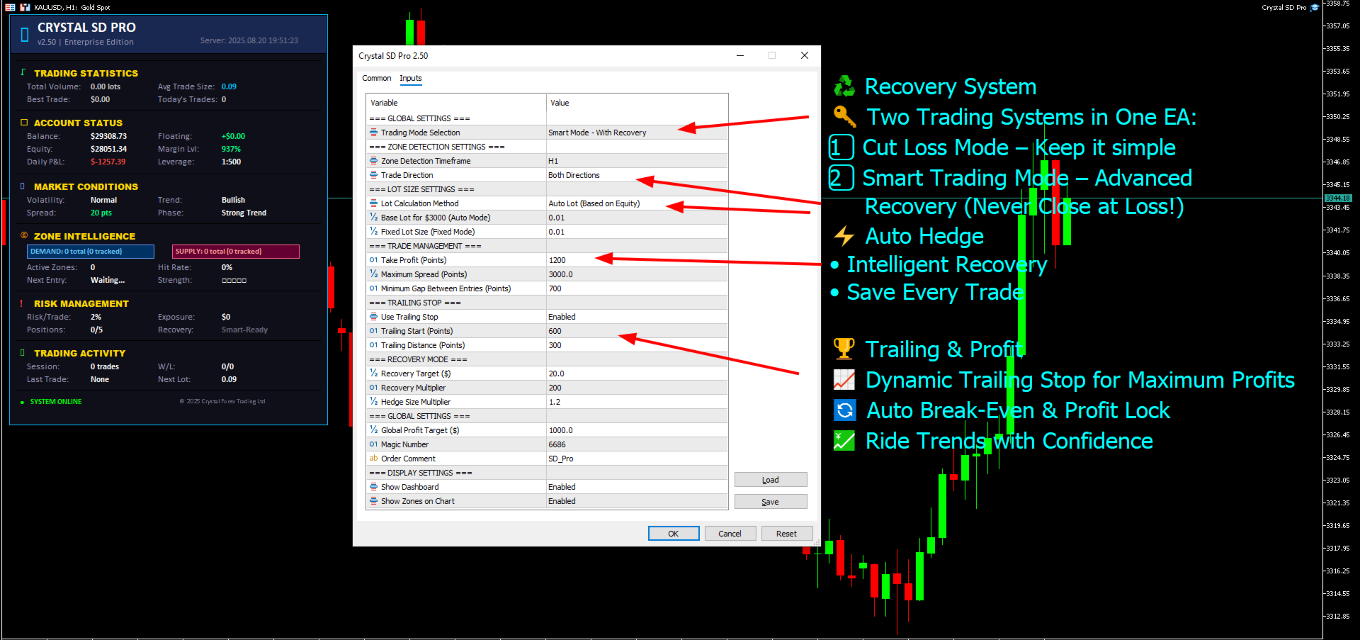 Crystal SD Pro — полностью автоматический советник для MetaTrader 5, торгующий только по институциональным зонам спроса и предложения. Он использует мульти-таймфрейм анализ и подтверждения для открытия сделок только в наиболее вероятных точках.