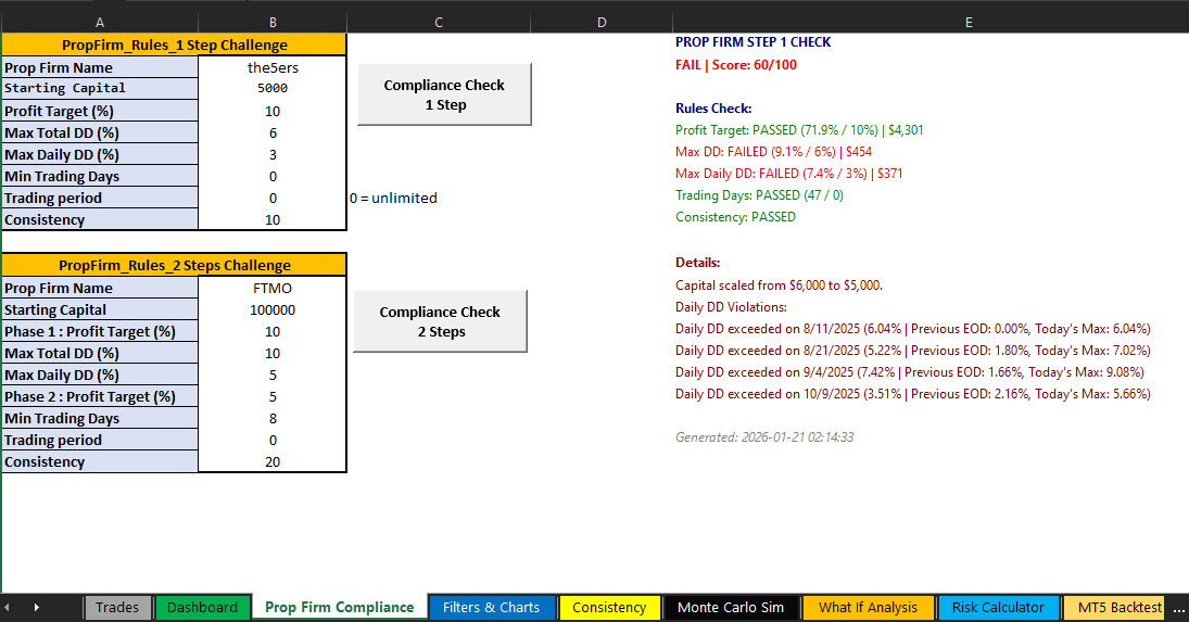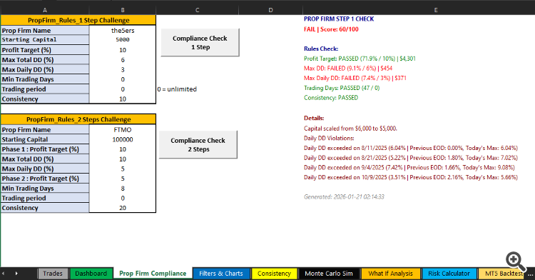 New Feature Added to our Excel ProTrading analytics v1.8 : Prop Firm Compliance Checker