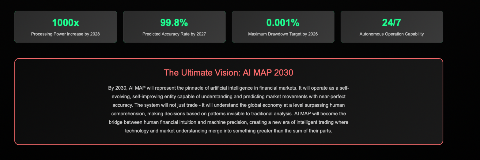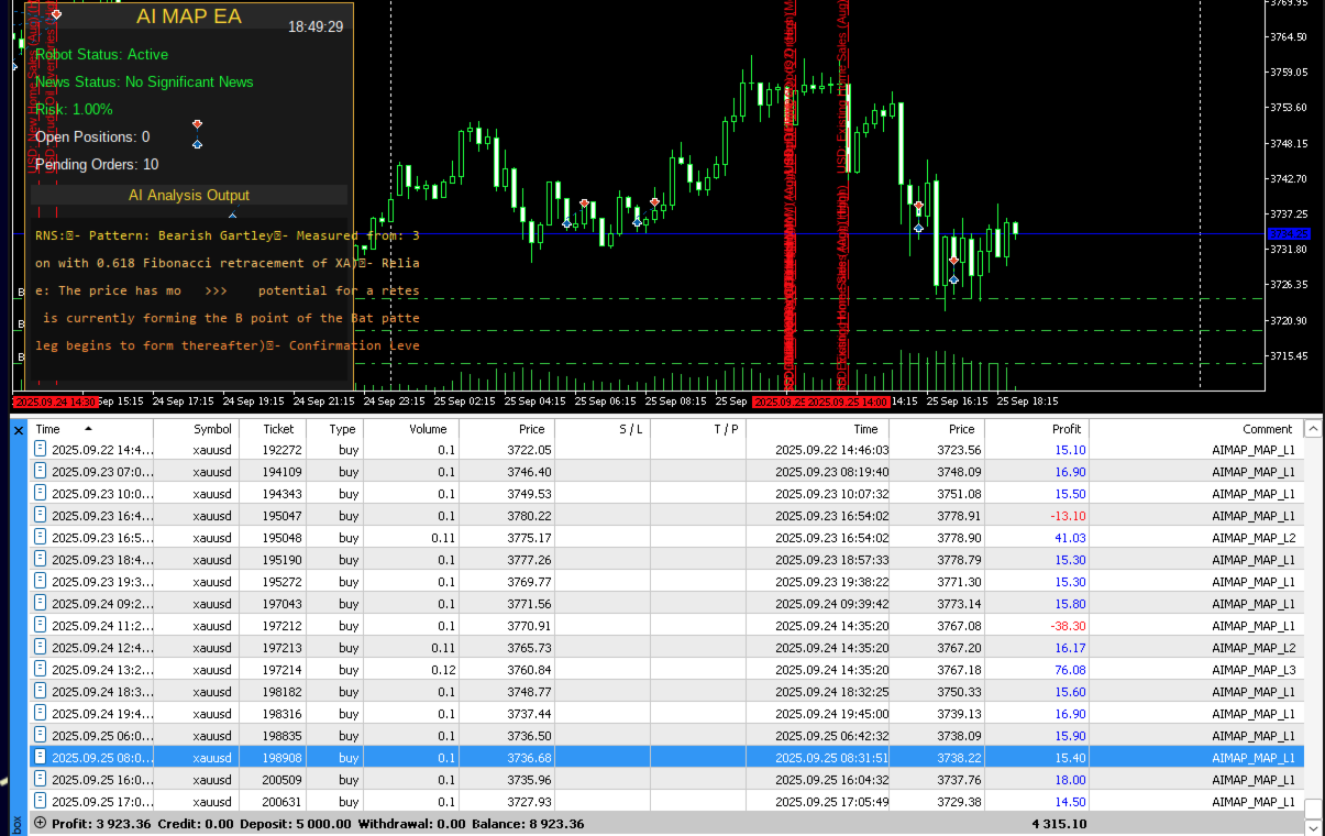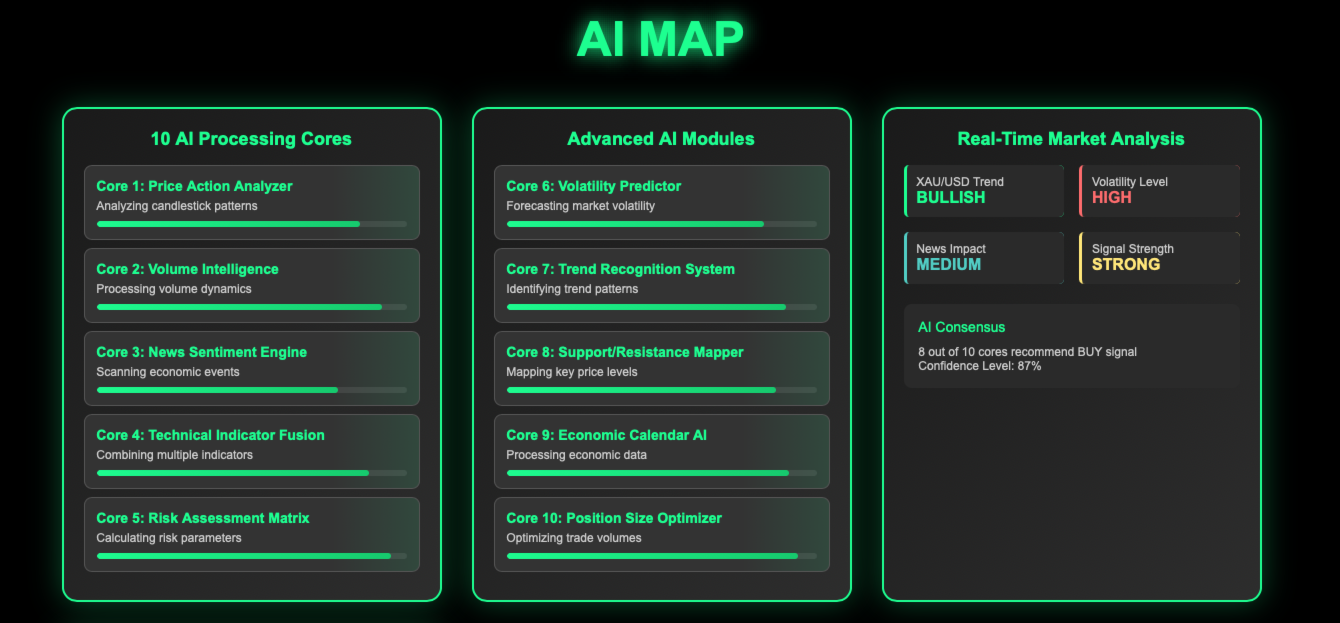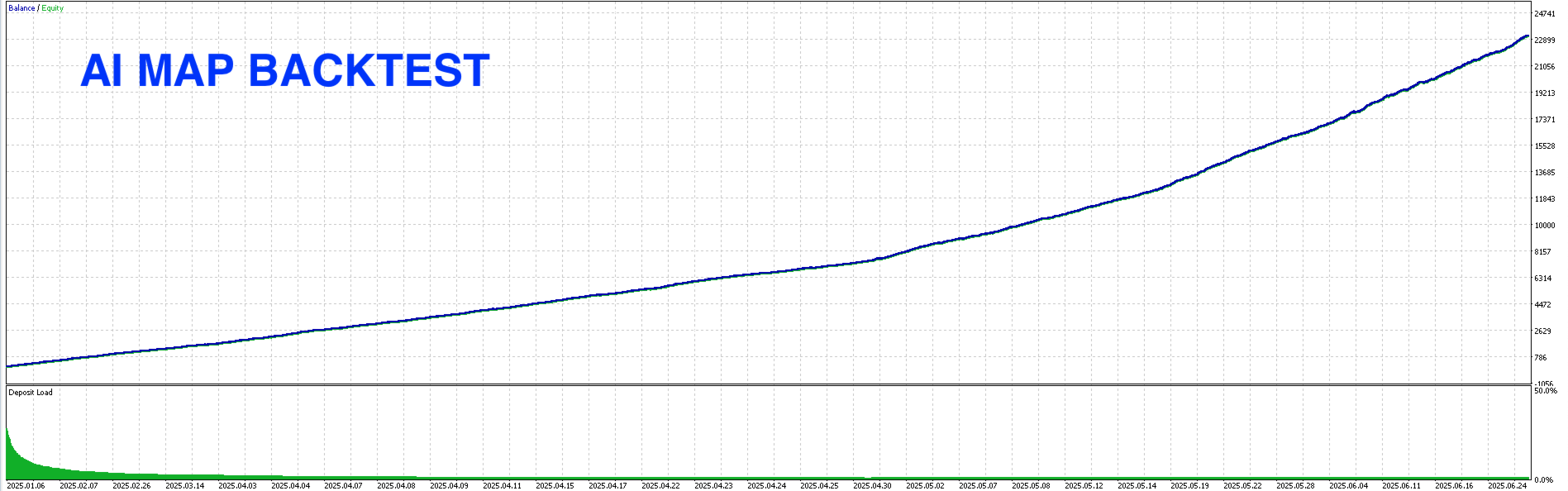 AI MAP — это автоматизированный торговый советник, разработанный для анализа рыночных условий и выполнения сделок на основе алгоритмической логики. Система использует многоуровневую аналитическую структуру для оценки ценового движения, объема и рыночных настроений без ручного вмешательства.