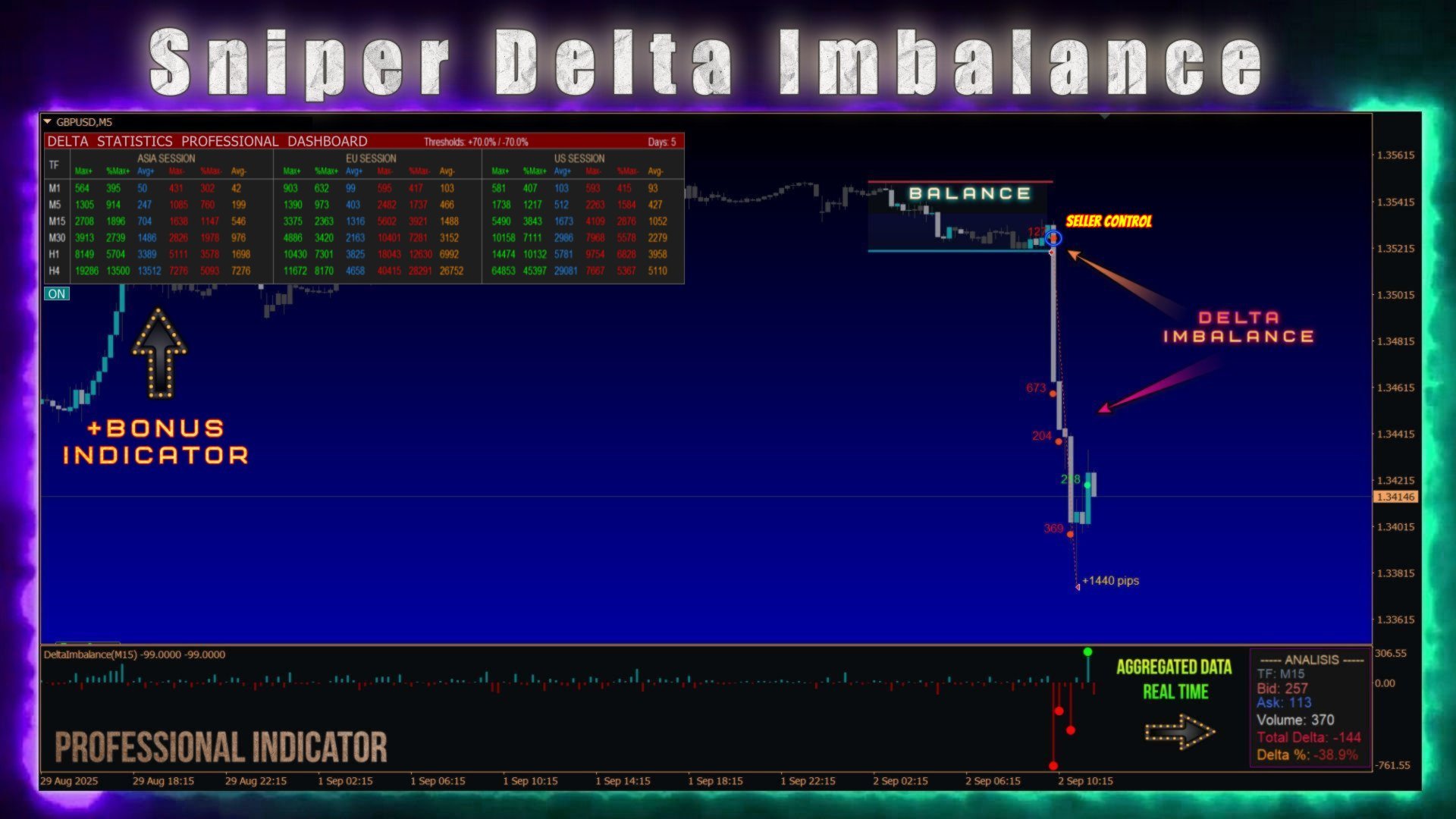 ✅ В отличие от большинства индикаторов, которые всего лишь анализируют прошлое и выдают сигналы с запозданием (постфактум).Sniper Delta Imbalance работает с данными в реальном времени.