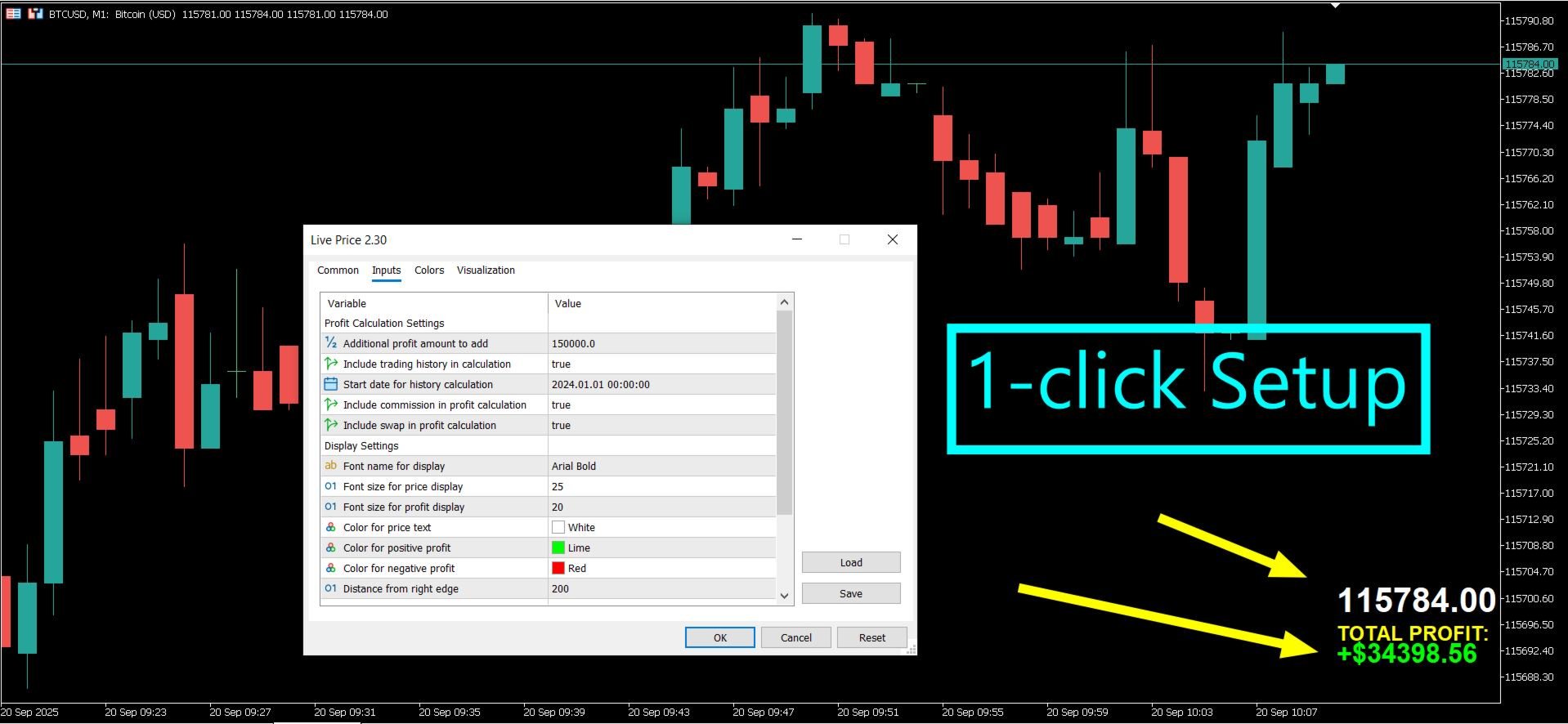 Этот профессиональный индикатор обеспечивает отображение цены в реальном времени и комплексное отслеживание прибыли непосредственно на вашем графике - необходим для высокочастотной торговли и прямых торговых трансляций.