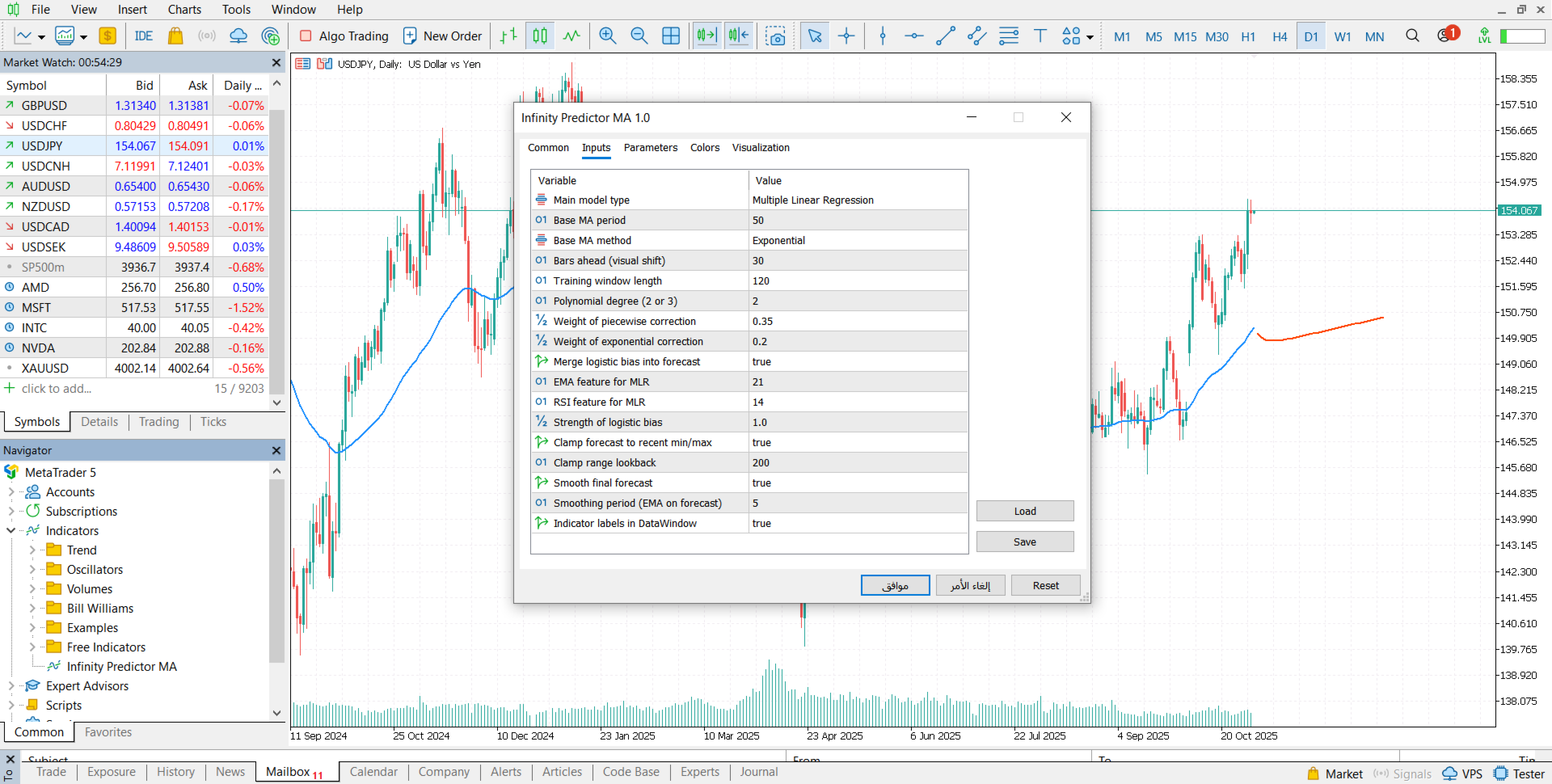 The engine behind Infinity Predictor MA combines multiple advanced regression models to capture both smooth trends and sudden market shifts. Polynomial and Multiple Linear Regression form the core, while Piecewise and Exponential Regression provide corrective adjustments. A logistic bias is also merged into the forecast, adding a probability‑driven tilt toward bullish or bearish outcomes. The result is a forecast line that feels alive—adapting to curves, accelerations, and turning points in price action.