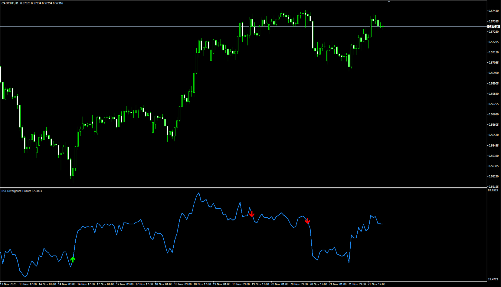 - Clear Signals: Arrows directly in the RSI window indicating where the divergence occurs.