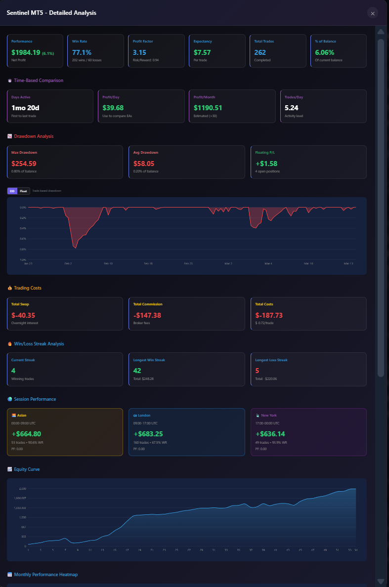 To be honest. There are some EAs out there that always leave me with a certain feeling of insecurity, even though they're quite profitable. With Sentinel, I have to say that from the very beginning I've felt that my investment is securely controlled! This is an EA that I can simply let run and trust 100% without constantly feeling like I need to intervene manually.