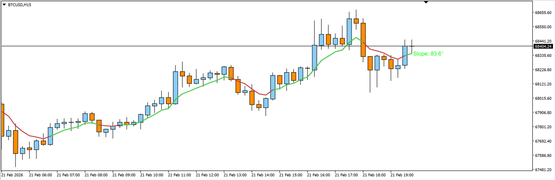 Live Angle Display: A floating text label attaches directly to the current price, showing you the exact, live mathematical degree of the slope (e.g., Slope: 45.2°).