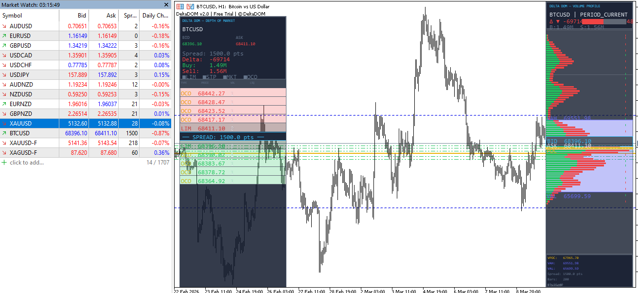 Para activar el DOM, simplemente vaya a la visualización del mercado, seleccione el símbolo del gráfico donde tiene el indicador, haga clic derecho y seleccione profundidad de mercado, y se activará el DOM.