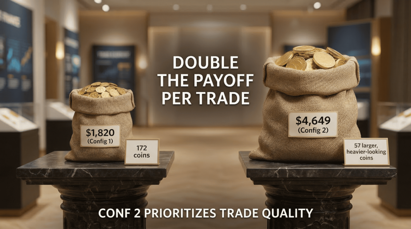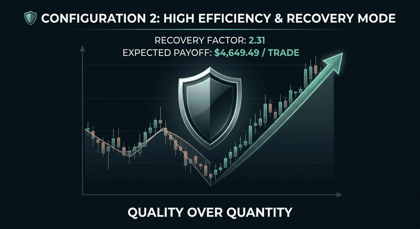 Эта конфигурация отделяет серьёзных трейдеров от остальных. Ожидаемая прибыль $4,649 за сделку более чем в два раза выше, чем в Конфигурации 1 — это означает значительно более высокое качество и избирательность входов. Фактор восстановления 2.31 (против 1.52 в Pass 147) показывает, что при просадках система восстанавливается значительно устойчивее.