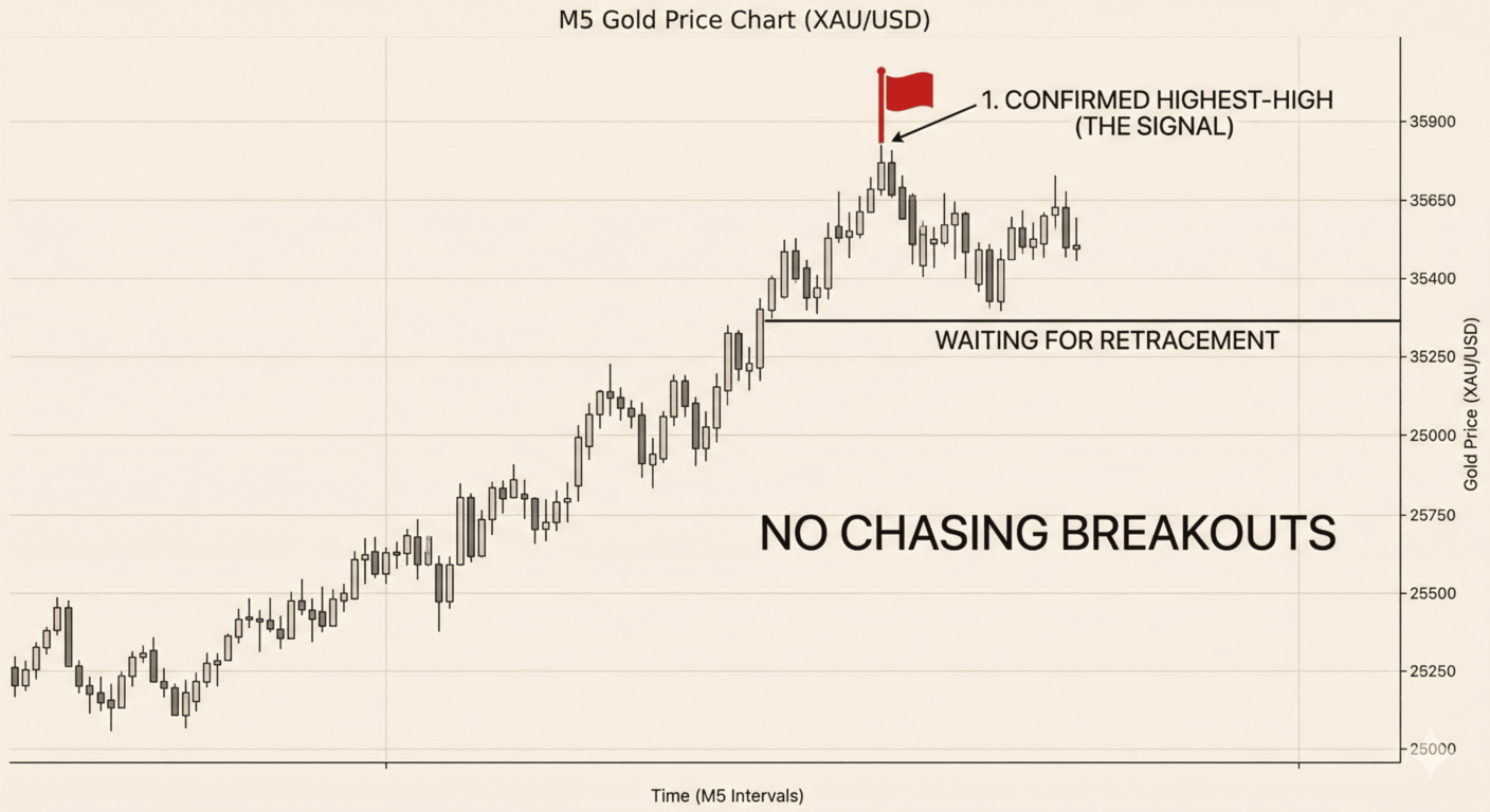 Структурный анализ — советник непрерывно отслеживает движение цены на M5 по XAUUSD, выявляя подтверждённые новые максимумы, сигнализирующие о доминирующем бычьем импульсе.