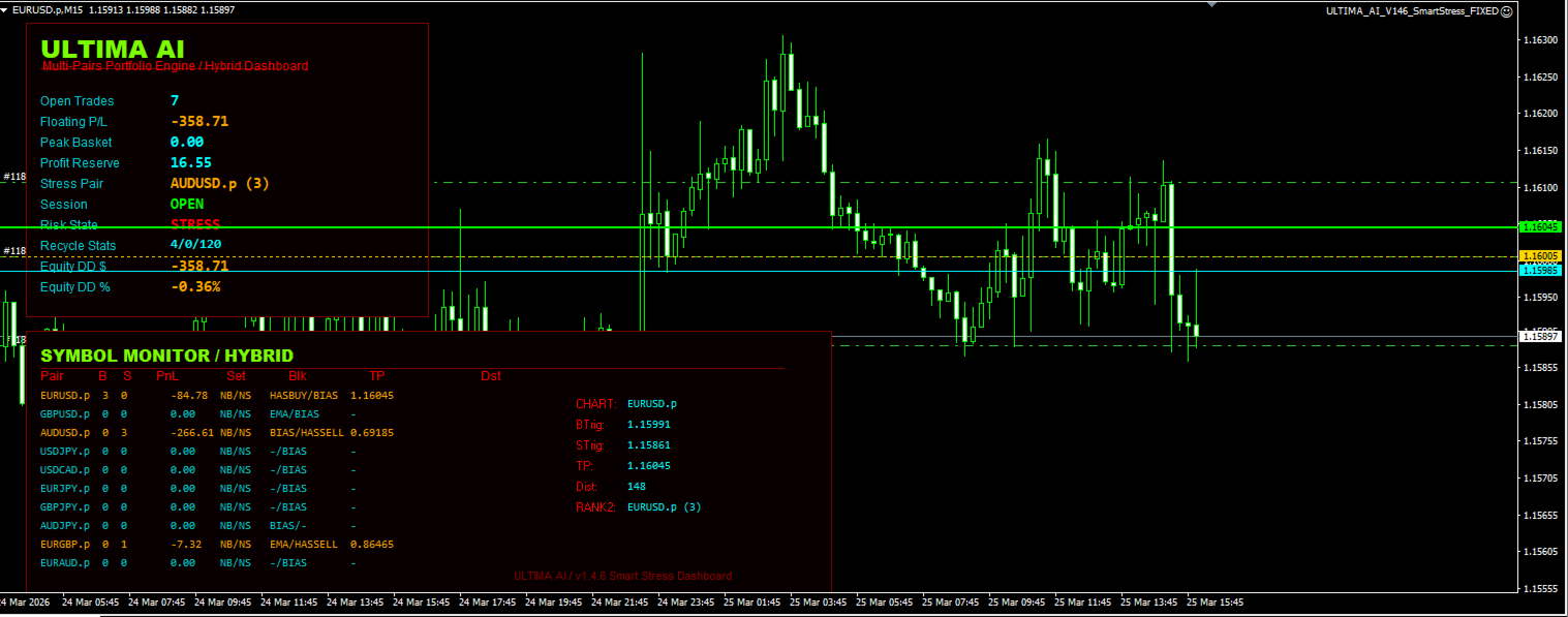 ULTIMA AI is an advanced MetaTrader 4 Expert Advisor designed to manage a multi-symbol trading portfolio from a single chart, using an intelligent combination of basket logic, profit reserve management, smart stress handling, partial risk reduction, and a premium real-time dashboard.