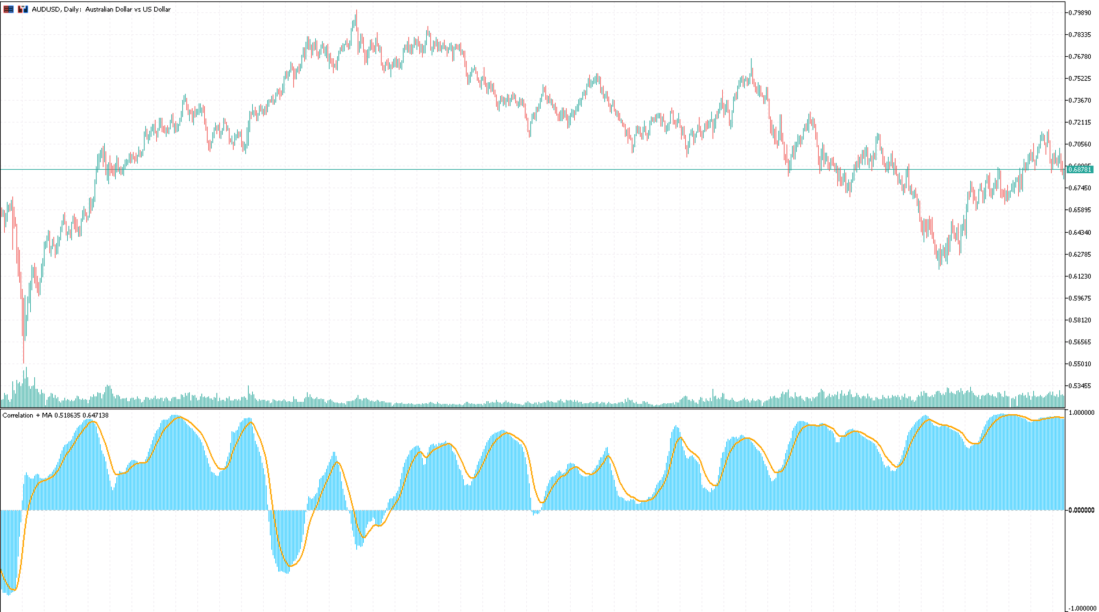 An optional Moving Average (SMA or EMA) is overlaid on the correlation histogram to help identify trend direction and regime changes in the relationship between the two instruments.