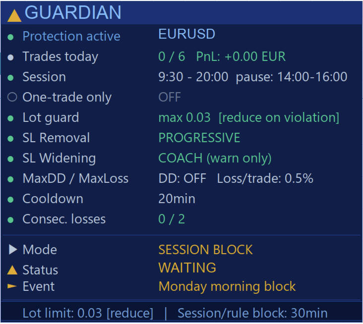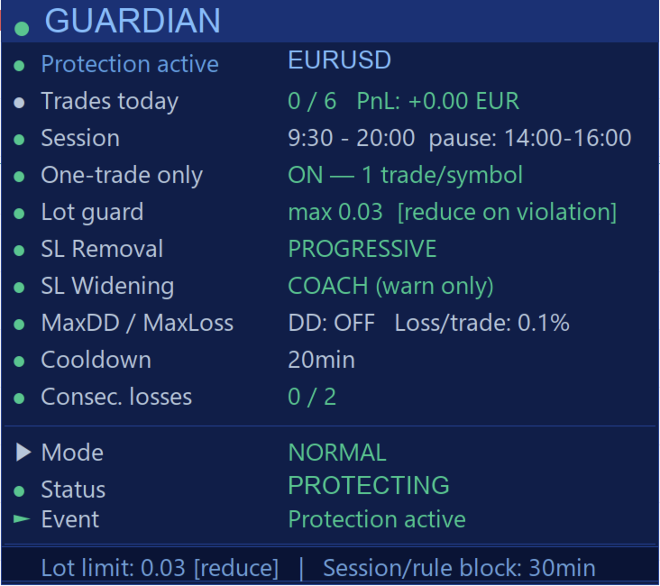 | Consecutive Loss Block | After N losses, GuardianPro blocks trading for the day. The loss counter accumulates daily without reset on win. |