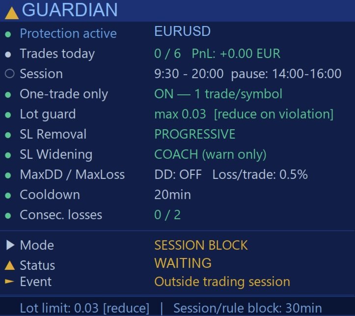 Every trader knows the feeling: moving a stop loss just a little, opening one trade too many, staying in the market past the planned session. GuardianPro is built to stop those moments before they become losses.