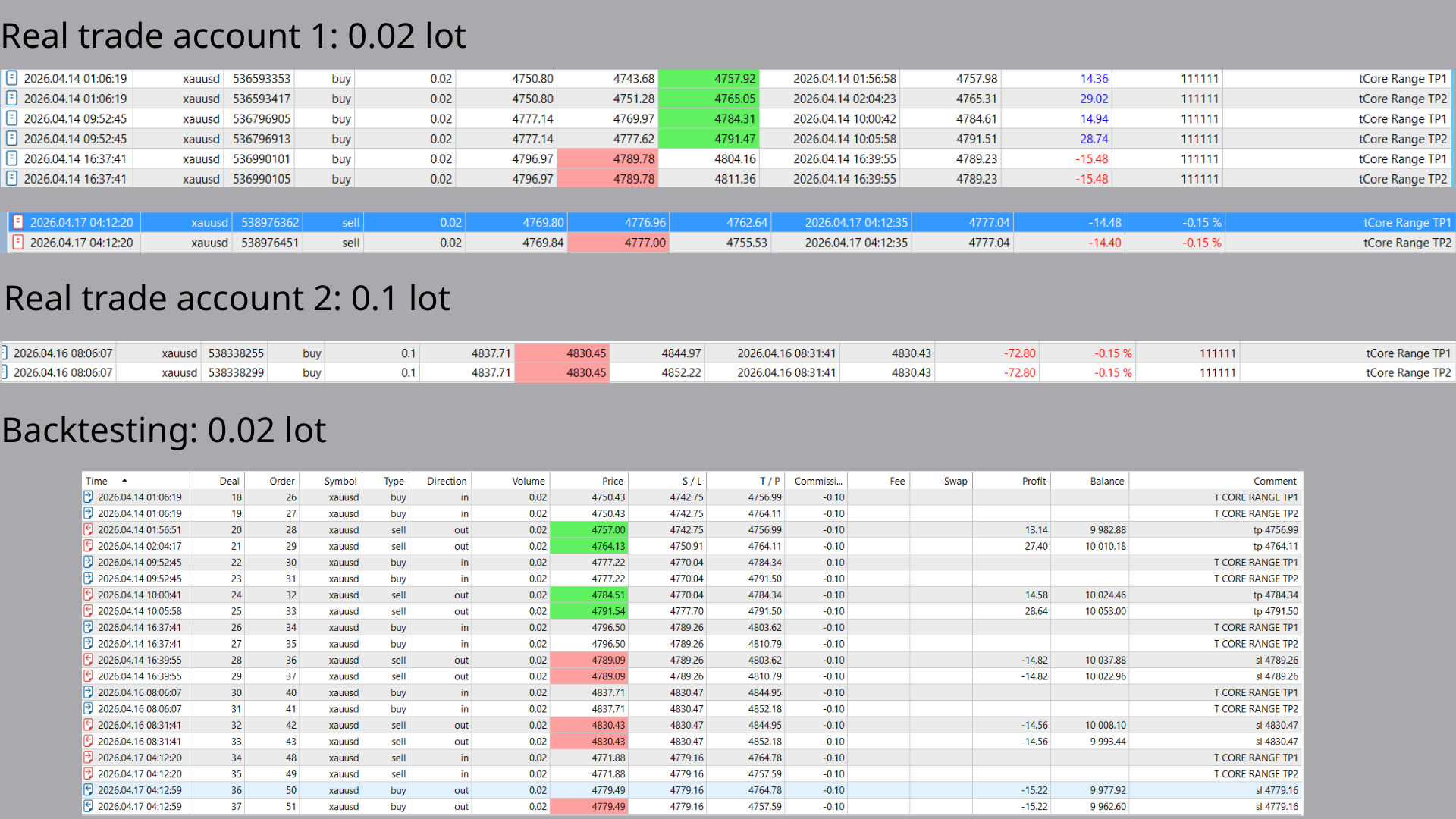 I am also sending a comparison image between the backtest and real trades on a small account (0.02 lot) and a large account (0.1 lot). You should compare the timestamps; the results between the backtest and real trades are very similar (with slight differences due to slippage). This proves that the EA has a high level of consistency between backtesting and live trading. Since you already know the backtest shows stable profits on a monthly basis or longer, losing a few trades is perfectly normal. Just be patient and wait for the market volatility to return, bro.