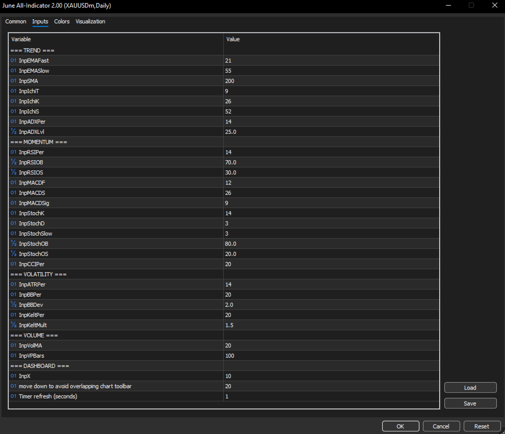 - RSI / MACD / Stochastic / CCI settings
