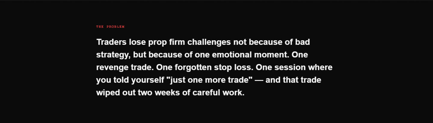 One revenge trade. One position left open over the weekend. One news spike that hits your daily loss limit before you even open your laptop. You had the edge. You had the plan. And then discipline failed — because discipline always fails under pressure.