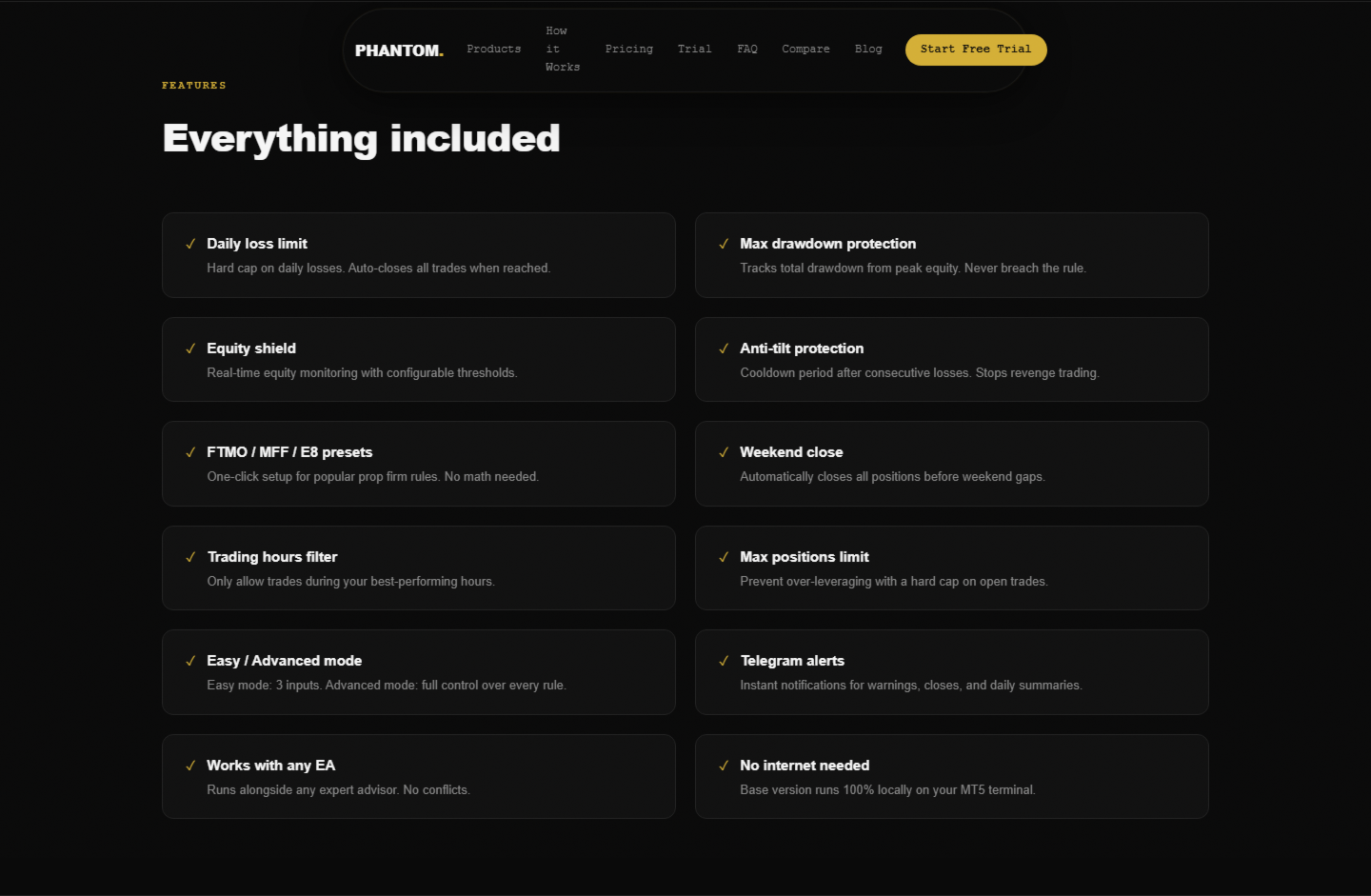 PHANTOM Guardian is a MetaTrader 5 risk enforcement utility. It runs silently alongside your trading — manual or EA — and enforces every rule your prop firm requires. The moment a limit is breached, Guardian acts. No delay, no hesitation, no human error.