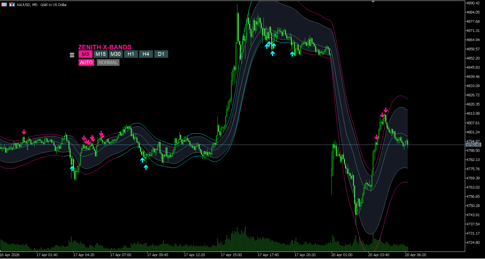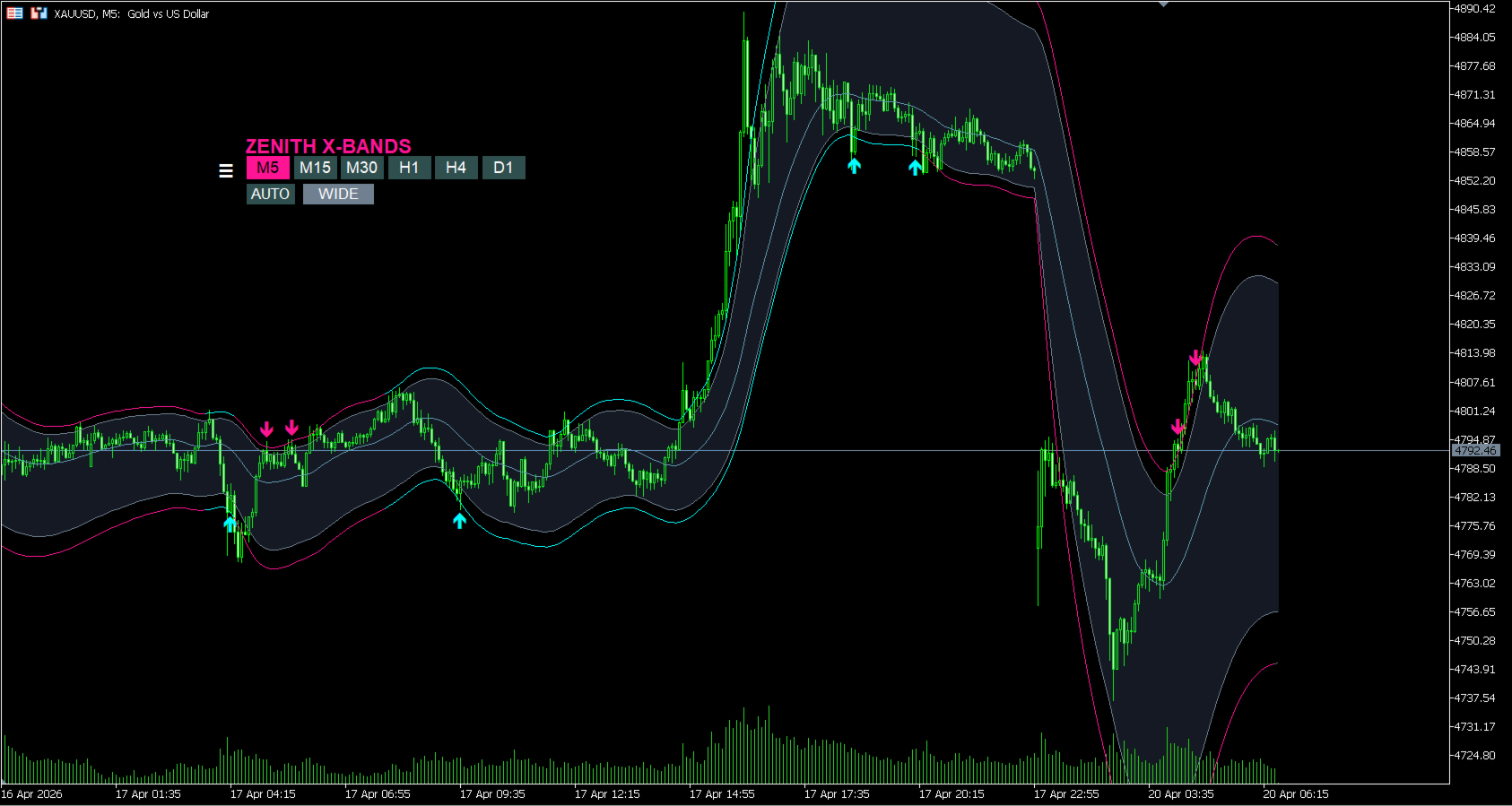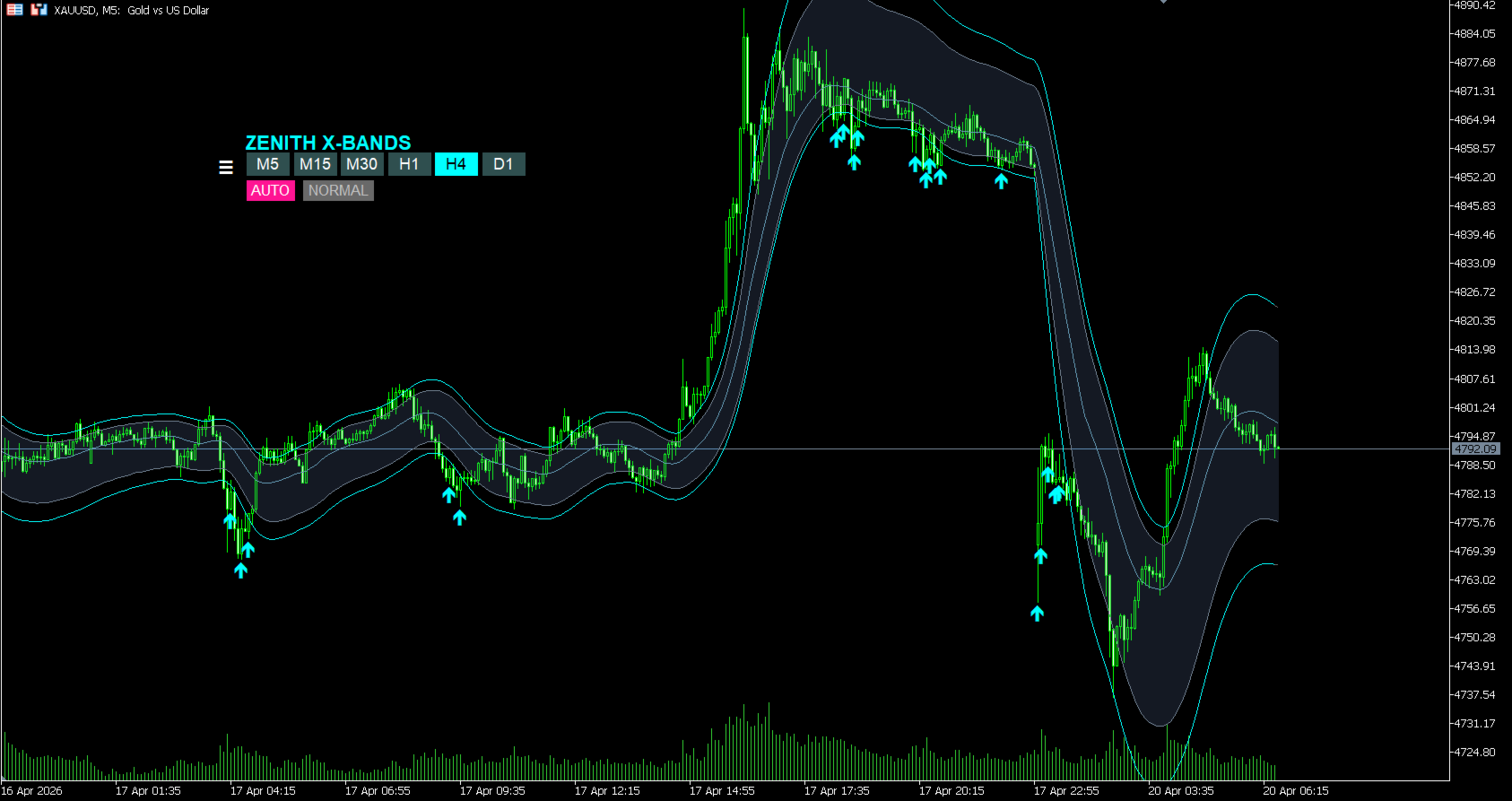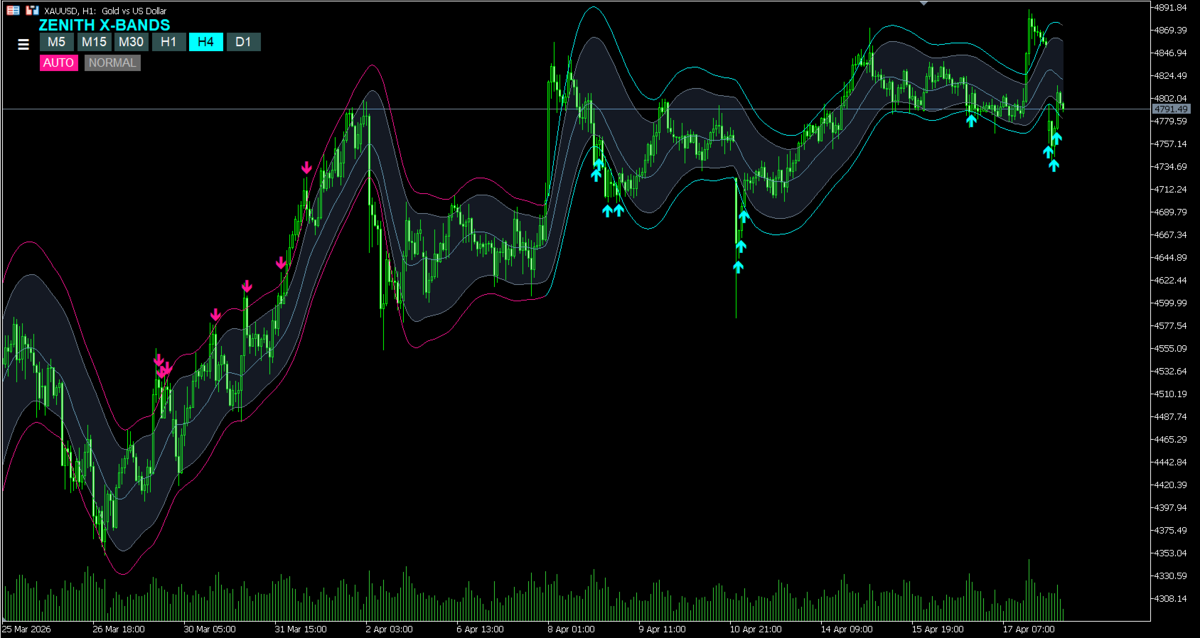 Automatically adjusts band width based on volatility. No tedious setup required.