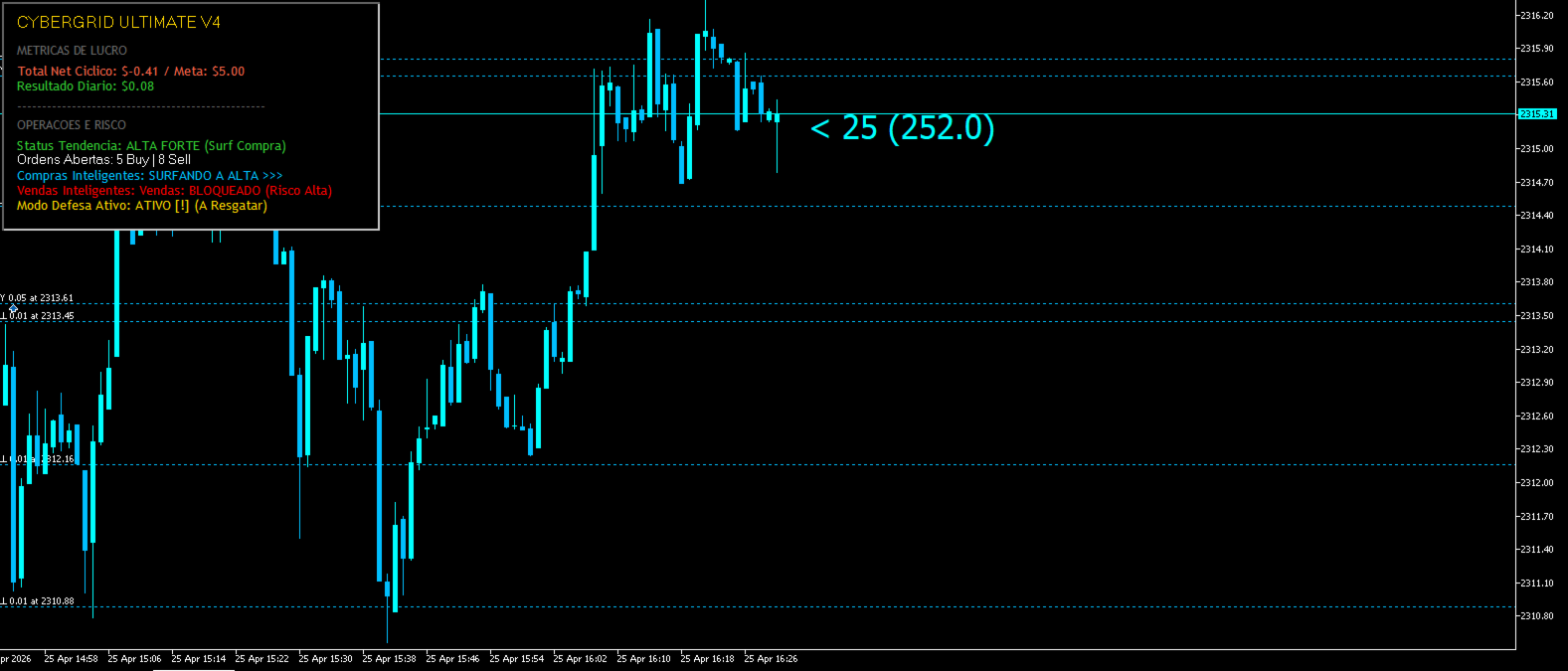 CyberGrid Ultimate V4 — это не просто советник (Expert Advisor); это алгоритмическая боевая машина, созданная для доминирования на Золоте (XAUUSD) в MetaTrader 5. Разработанный специально для счетов типа Hedge, он сочетает в себе защитную математическую сетку ордеров с анализом институционального потока. Это позволяет вам ловить импульсы волатильности драгоценного металла, надежно защищая капитал во время флэта.