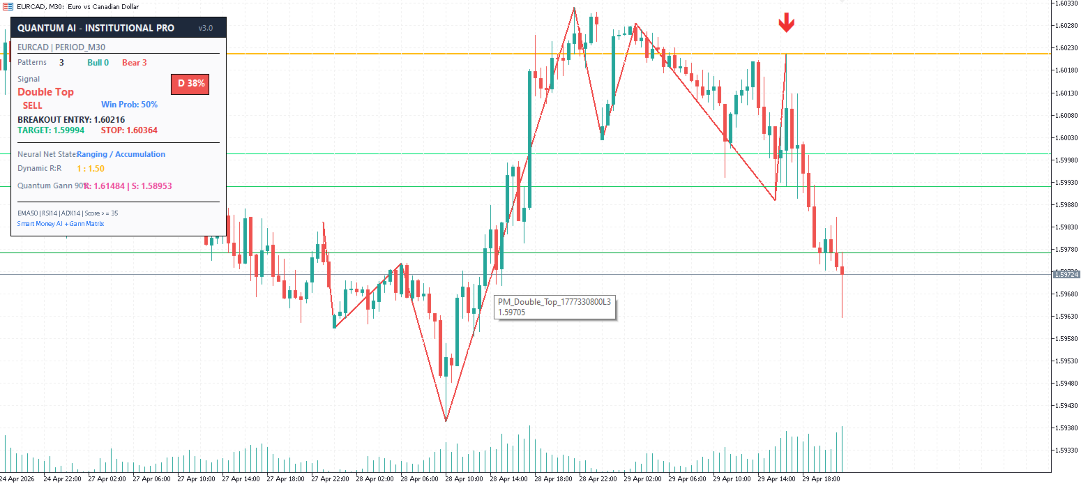 When the AI detects a high-probability pattern (Grade B, A, or A+), a Green or Red Arrow will appear on the chart, and horizontal execution lines will be plotted.