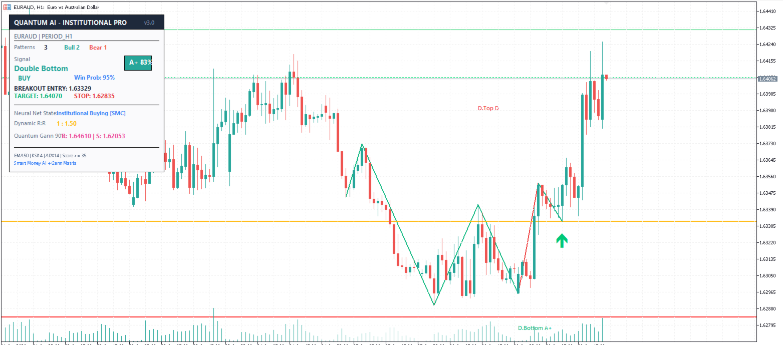 - Signal & Grade: Displays the detected pattern (e.g., "Double Bottom") and its AI Grade (A+ to D) with the calculated Win Probability %.