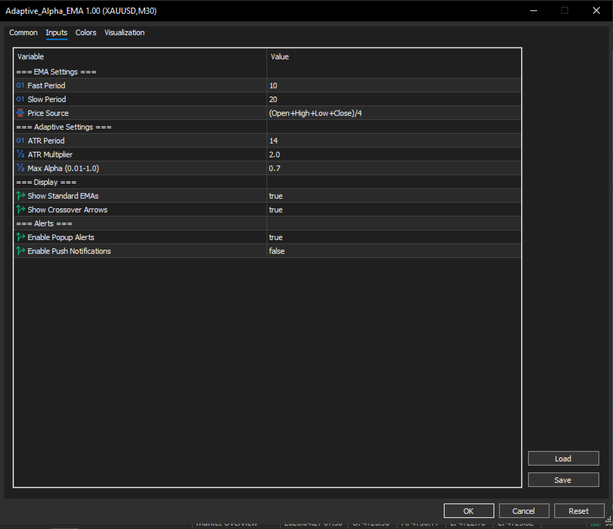 - Show/Hide Standard EMAs — Keep your chart clean when you only want the adaptive lines.
