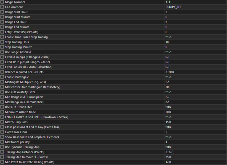 Символы: Ориентирован на основные валютные пары (Настройки USDJPY по умолчанию, EURUSD, GBPUSD...) и фондовые индексы (US30, NAS100, DAX40...) во время открытия соответствующих сессий.