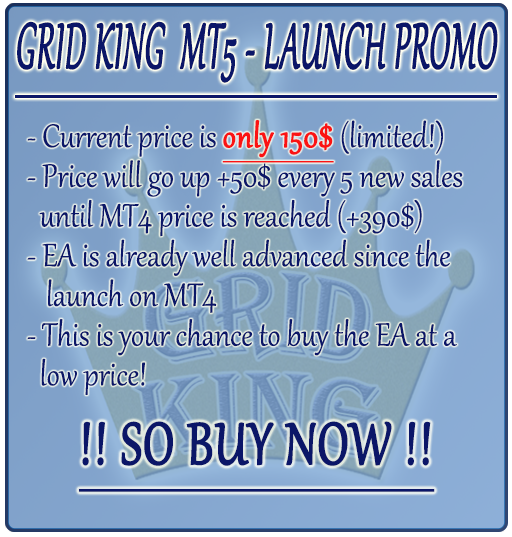 Also, since the launch the MQL5 version of grid king, it did not have any losses (it only launched 10 days ago), so again, I asked to have some more details about his losses because they seem unlikely to me. But I would at least be able to assist with what was wrong with the setup. Instead, I get no answer from the guy, but just a bad review based on nonsense. If people are not willing to learn, I can not help... I can only "guess" he was using it on a much too small account.. but since he apparently doesn't want to talk about it, there is nothing more I can do to help.