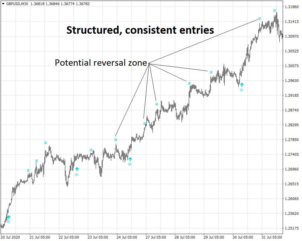 - High-precision entries along the current trend
