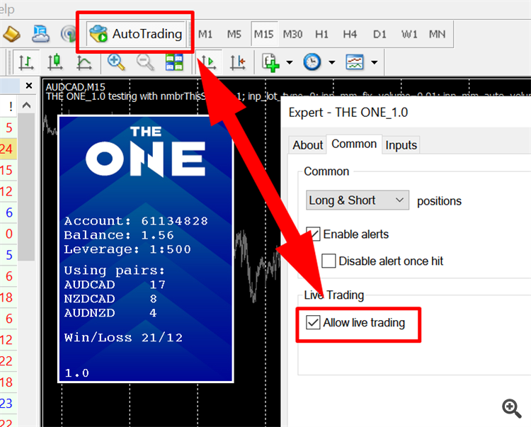 Hello. You need to add THE ONE Expert to one of the using pairs chart. For example AUDCAD.