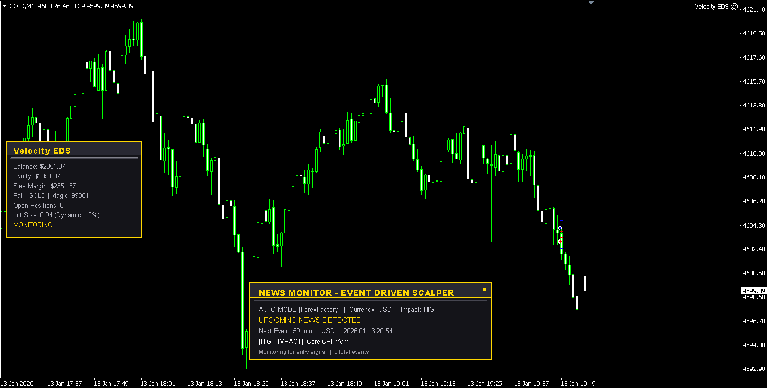 VELOCITY EVENT DRIVEN SCALPER - Профессиональная система торговли на новостях Перед добавлением «Velocity EDS» на живой график не забудьте включить «Автоматический режим новостей»! Velocity EDS — это передовая алгоритмическая торговая система, разработанная для извлечения прибыли из важных экономических событий и новостей. Этот советник реализует сложные стратегии входа и выхода, специально разработанные для волатильных рыночных условий, которые возникают вокруг важных объявлений. Стратегия