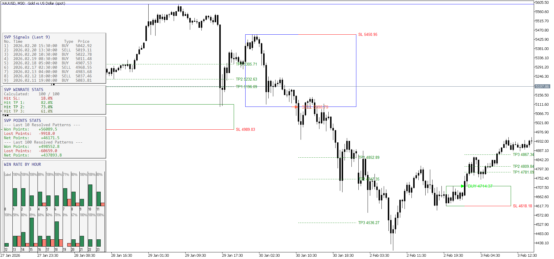 SVP Zones расшифровывается как Структура Объем Паттерн Зона - индикатор создан для автоматизации моей стратегии при создании которой было потрачено 4 года иследований рынка золота и то как обьем влияет на структуру цены, при соблюдении нескольких условий индикатор формирует зону и при выходе цены из зоны в правильном направлении индикатор подает сигнал, это все что вам нужно знать, важное замечание так как индикатор считывает структуру цены по закрытым свечам то на истории сигнал подается