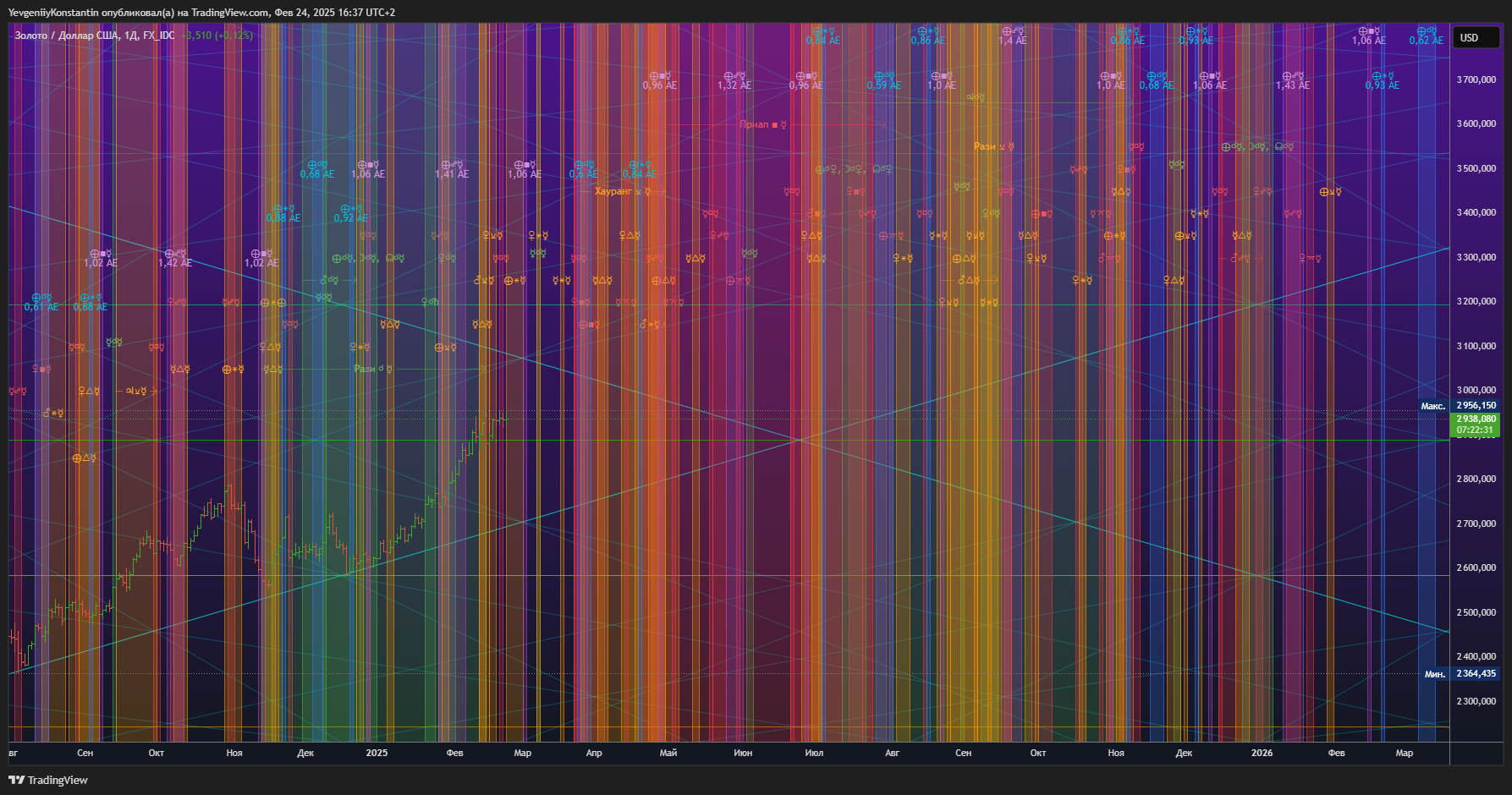 В трейдинге (финансовой спекуляции) самое главное не уровни поддержки и сопротивления, как вас злонамеренно сводят с истинного пути брокерские компании преподавая вам в кавычках "финансовую грамотность", они также злонамеренно не дают вам котировки финансовых инструментов, во всех платформах, в том числе и этой, с выходными днями, также, обрезая котировки до пятидневной недели, они злонамеренно не делают расчёт котировок на несколько лет вперёд. А раньше делали! Почему так? Потому что действительно - Квадрат 9 В.Д. Ганна гармоничен с нашей природой в нашей галактике. Они это увидели и замели следы. А главное это: Время! Время решает до какого уровня будет подниматься цена и до какого она будет снижаться.Поэтому, смотря на Квадрат 9 - вы должны в первую очередь смотреть на время а не на углы, углы только помогают ориентироваться в пространстве, но время решает всё.Дальше, в следующей идеи, я опубликую астрономическо-астрологический расчёт времени.Мой прогноз, учитывая развитие науки, космонавтики, и военной инженерии что золото будет расти. Но не забывайте, что энергия - это волна, не бывает прямых линий.